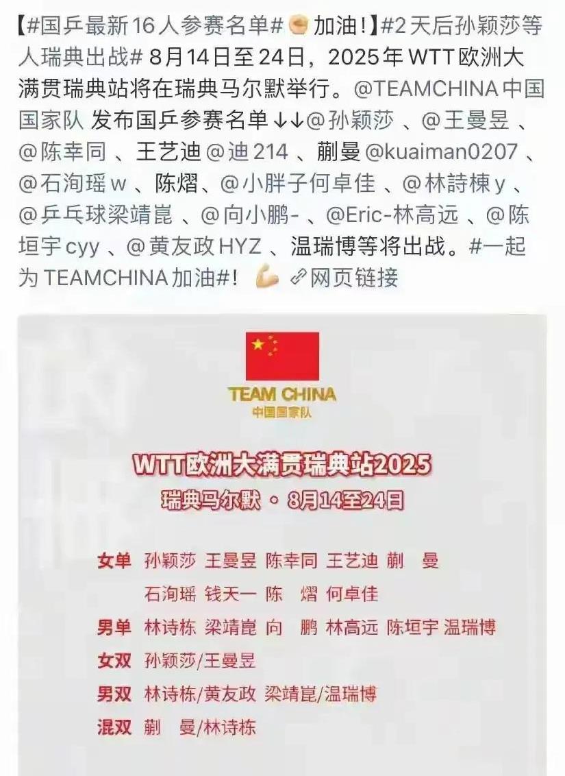 岁月如矢,匆匆掠过历史苍穹 2025年8月14日,2025WTT欧洲大满贯瑞典站赛事启幕,引领我们踏入顶级体育盛宴。 14日,咪咕视频直播,球迷轻点屏幕,与选手同频心跳。资格赛上,选手多场对决同步上演,汗水与拼搏交织成视觉盛宴。 15日正赛抽签仪式受瞩目,国乒16人参赛,众人盼好签,避过早内战。女单赛场,孙颖莎、王曼昱等出战,含金量高,大家期待包揽四强。 横滨站陈幸同夺冠,孙颖莎未气馁,守区域、胜外协,斗志昂扬。瑞典站她仍是“定海神针”,挥拍有力,为国乒女单添信心。 这些有紧张、拼搏,更有期待与热爱的风景,将永驻记忆,让我们继续见证精彩! #头号创作者激励计划# 图片取材于网络侵删