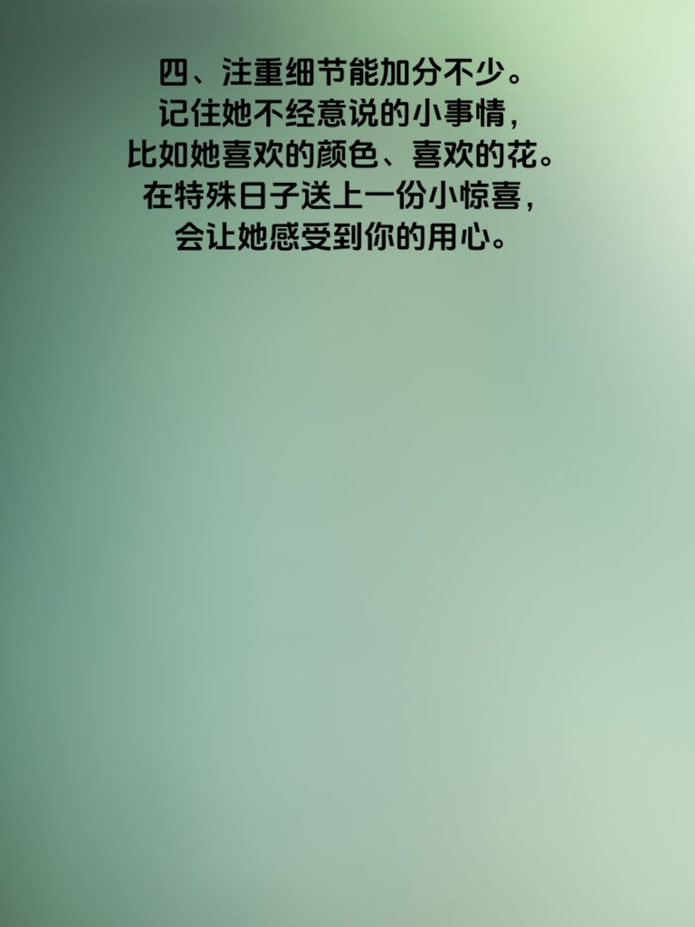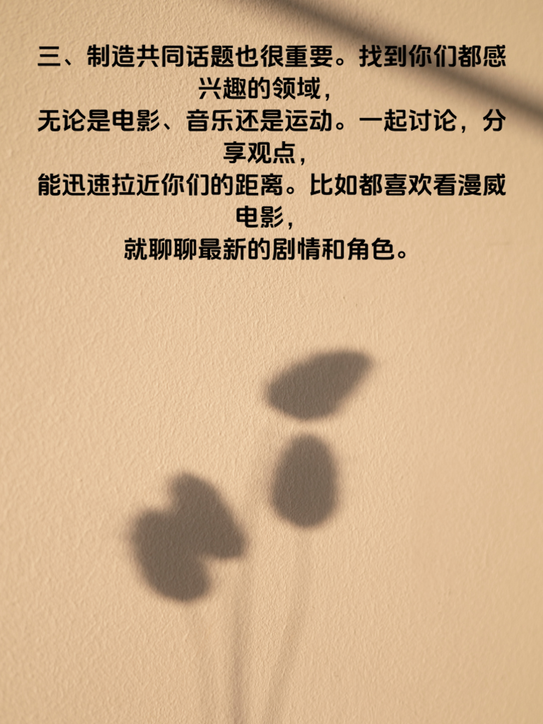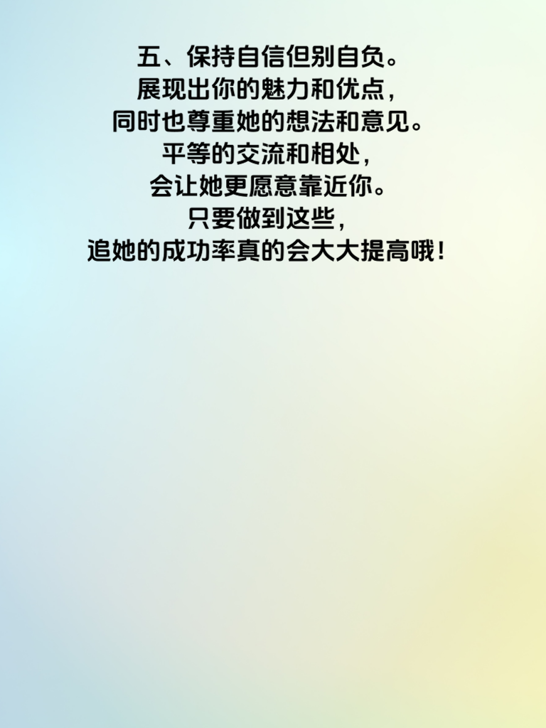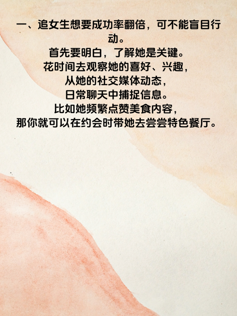 一、追女生想要成功率翻倍,可不能盲目行动。首先要明白,了解她是关键。花时间去观察她的喜好、兴趣,从她的社交媒体动态,日常聊天中捕捉信息。比如她频繁点赞美食内容,那你就可以在约会时带她去尝尝特色餐厅。 二、真诚是必杀技。不要试图用套路去糊弄她,真心实意地对待她的喜怒哀乐。当她遇到困难,第一时间给予关心和帮助,用行动证明你在乎她。 三、制造共同话题也很重要。找到你们都感兴趣的领域,无论是电影、音乐还是运动。一起讨论,分享观点,能迅速拉近你们的距离。比如都喜欢看漫威电影,就聊聊最新的剧情和角色。 四、注重细节能加分不少。记住她不经意说的小事情,比如她喜欢的颜色、喜欢的花。在特殊日子送上一份小惊喜,会让她感受到你的用心。 五、保持自信但别自负。展现出你的魅力和优点,同时也尊重她的想法和意见。平等的交流和相处,会让她更愿意靠近你。只要做到这些,追她的成功率真的会大大提高哦!