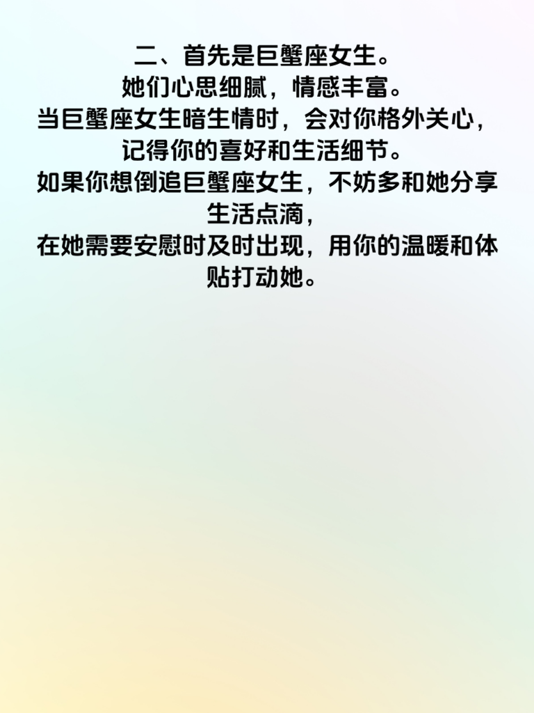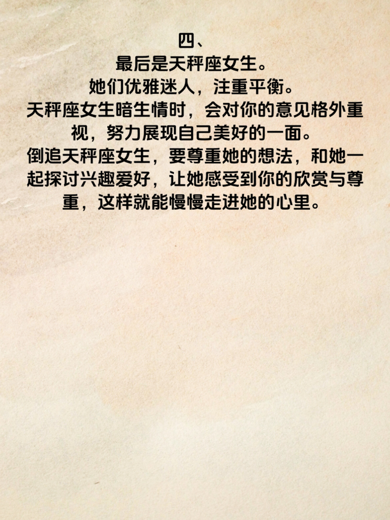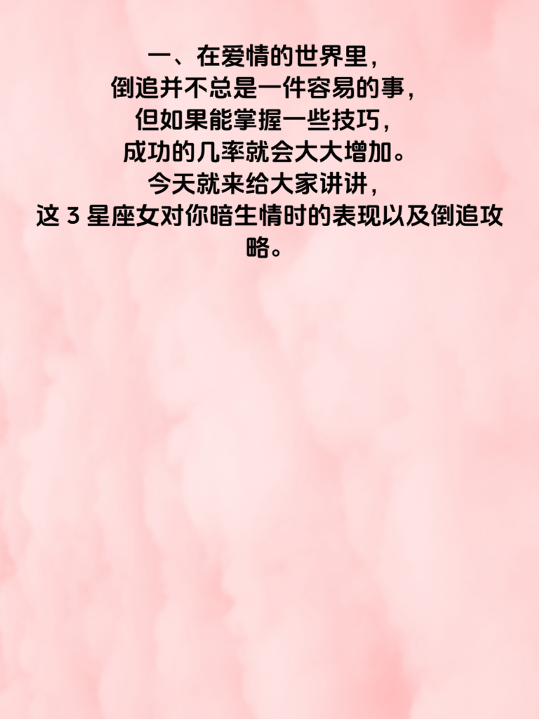 一、在爱情的世界里,倒追并不总是一件容易的事,但如果能掌握一些技巧,成功的几率就会大大增加。今天就来给大家讲讲,这3星座女对你暗生情时的表现以及倒追攻略。 二、首先是巨蟹座女生。她们心思细腻,情感丰富。当巨蟹座女生暗生情时,会对你格外关心,记得你的喜好和生活细节。如果你想倒追巨蟹座女生,不妨多和她分享生活点滴,在她需要安慰时及时出现,用你的温暖和体贴打动她。 三、接着是双鱼座女生。她们浪漫且富有幻想。双鱼座女生暗生情时,会常常陷入对你的幻想中,眼神里满是温柔。倒追双鱼座女生,要和她一起营造浪漫氛围,陪她看星星、听音乐,给她编织美好的爱情梦。 四、最后是天秤座女生。她们优雅迷人,注重平衡。天秤座女生暗生情时,会对你的意见格外重视,努力展现自己美好的一面。倒追天秤座女生,要尊重她的想法,和她一起探讨兴趣爱好,让她感受到你的欣赏与尊重,这样就能慢慢走进她的心里。