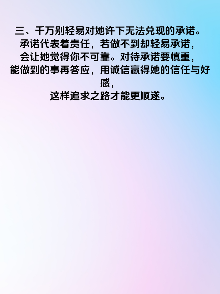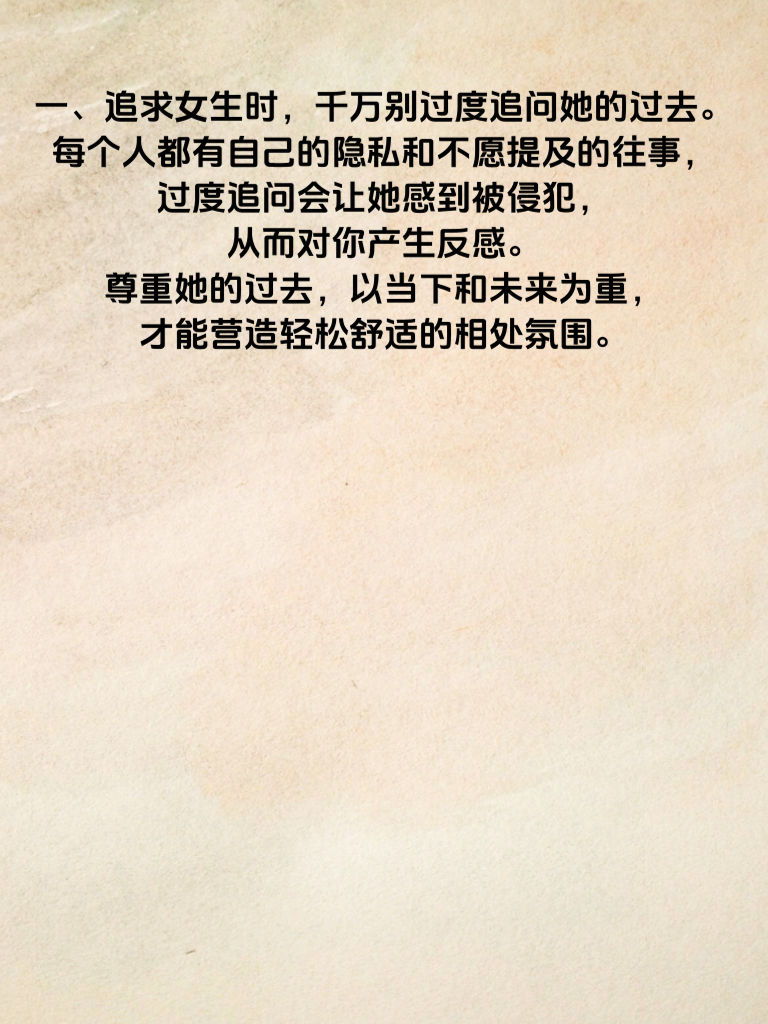 一、追求女生时,千万别过度追问她的过去。每个人都有自己的隐私和不愿提及的往事,过度追问会让她感到被侵犯,从而对你产生反感。尊重她的过去,以当下和未来为重,才能营造轻松舒适的相处氛围。 二、不要在她面前过度炫耀自己。女生更看重内在品质而非外在光环。过度炫耀财富、成就等,会让她觉得你虚荣且浮躁。真诚地展现自己的优点,踏实地努力,用实际行动吸引她,才是长久之道。 三、千万别轻易对她许下无法兑现的承诺。承诺代表着责任,若做不到却轻易承诺,会让她觉得你不可靠。对待承诺要慎重,能做到的事再答应,用诚信赢得她的信任与好感,这样追求之路才能更顺遂。