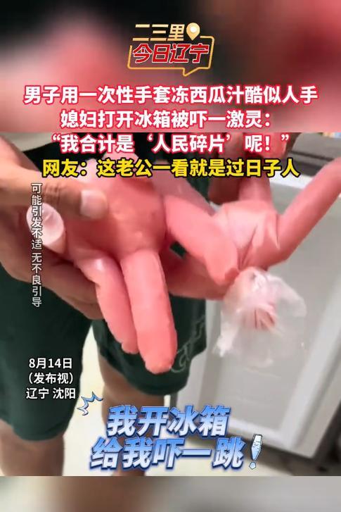 “这是真吓人!”近日,辽宁沈阳,一女子上冰箱找雪糕吃,结果刚开冰箱门就把自己吓了一激灵,她竟然看到2只“血淋淋的手”!于是急忙喊来老公,质问对方冰箱里放了啥,原来,这是老公用一次性手套保存的西瓜汁。网友:两口子都是勤俭持家的人! 炎炎夏日,怎么少得了一个西瓜来解暑呢?但一个西瓜太大,不少人一次性吃不完,扔了太可惜,就只能放进冰箱里保存,不过不建议存放太长时间,不然吃了容易拉肚子。 据媒体8月14日的报道,前不久,关女士买了个大西瓜回家,结果夫妻二人没吃了,为了便于保存,关女士就给打成西瓜汁了,然后让老公放冰箱里冻上。 可是没想到,老公竟然用一次性手套来装西瓜汁,冻上后仿佛两只血淋淋的人手。 第二天,关女士去冰箱拿雪糕吃,结果一开门就看到了恐怖的一幕,她吓得急忙喊来老公,在确认了是西瓜汁后这才放心下来,但是要求立即给扔了。 老公听后还感觉有些可惜,说道:“别撇了,还能喝呐。” 网友看后表示,冰箱里凭空出现两只手,这一幕谁见了不得吓一跳,要是解释不清楚,可能真就报警了。 大家对于这件事是怎么看? 信息来源:《男子用一次性手套冻西瓜汁酷似人手媳妇打开冰箱被吓一激灵:“我合计是‘人民碎片’呢!”网友:这老公一看就是过日子人》二三里-今日辽宁