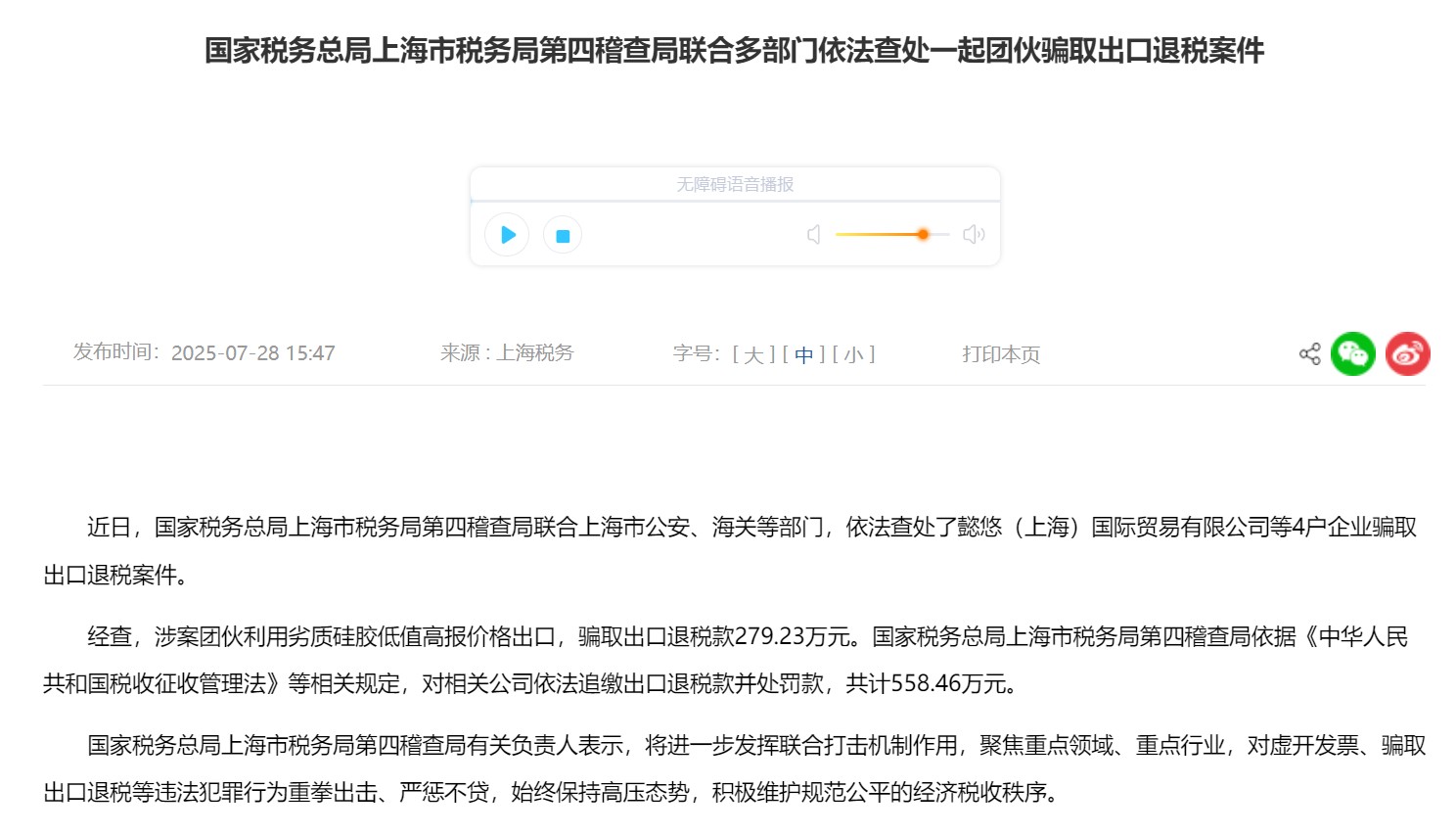 上海4家企业合伙以低值高报的方式骗取出口退税被查 【国家税务总局上海市税务局第四稽查局联合多部门依法查处一起团伙骗取出口退税案件】 近日,国家税务总局上海市税务局第四稽查局联合上海市公安、海关等部门,依法查处了懿悠(上海)国际贸易有限公司等4户企业骗取出口退税案件。 经查,涉案团伙利用劣质硅胶低值高报价格出口,骗取出口退税款279.23万元。国家税务总局上海市税务局第四稽查局依据《中华人民共和国税收征收管理法》等相关规定,对相关公司依法追缴出口退税款并处罚款,共计558.46万元。 国家税务总局上海市税务局第四稽查局有关负责人表示,将进一步发挥联合打击机制作用,聚焦重点领域、重点行业,对虚开发票、骗取出口退税等违法犯罪行为重拳出击、严惩不贷,始终保持高压态势,积极维护规范公平的经济税收秩序。 【来源:上海税务】 税与罚短评: 低值高报是骗取出口退税手段之一,主要通过虚抬价格、虚构交易、虚开增值税专用发票等方式,将低价值的产品以高价格的方式报关出口,并申报出口退税。 但是,低值高报并不必然会达到骗取出口退税的结果,也并不一定会构成骗取出口退税罪。其核心在于是否虚开增值税专用发票的方式虚增进项税额,用于申请出口退税,从而骗取国家出口退税款。