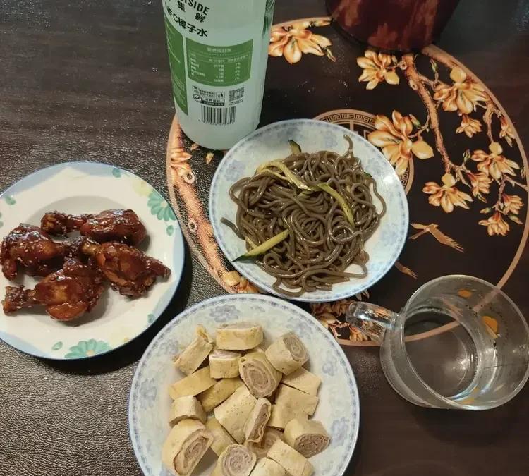 这就是我今天的晚餐,买的现成的。 我家小区里有个做食品的,叫小区团购吧,她建了一个群,业主买东西就私信她,她老公负责送门上货,小灶做的,质量卫生还是有保障的。 我自己一个人,吃饭还是有点小困难,一个人饭不好做,稍微做多点就剩,一顿想多吃几样菜,不现实呀,一样吃几口,其余都剩下了。 早餐还好,一个鸡蛋、一杯牛奶,外加一块面包片,这中午和晚上就难搞了。 我这人呢还不擅长做吃的,上班时都是在单位食堂吃,退休后最让我有落差的就是没地方蹭饭了。我对做美食一点兴趣没有,没兴趣就不愿学,除了一般家常便饭,复杂一点我都不会做。 现在只要有钱啥都好办,年轻人喜欢点外卖,咱也可以点,只是频次少点就好。 今天实在是不想做饭了,点了4个蜜汁小鸡腿,一份黄金蛋卷,商家送了一份蕨菜粉,饮料是上周儿子买的椰子汁,一顿饭就这样打发了。