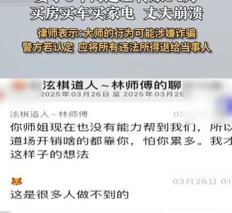 “彻底解释不清了!”江苏,女子长期失眠,就在网上找了个道士!被其收为弟子之后,她竟然前后转94万,给道士买房、买车、买家电,还承担对方日常开销,而她自己却省吃俭用,日均餐费不超20元,女子丈夫找到道士,对方却说是“自愿赠与”,只愿退10万! 更绝的是,这大姐月薪上万,却跟老公说只有四五千,背着老公把彩礼钱、装修贷,还有各种借来的钱一股脑儿往外掏。老公一开始还以为她在治失眠呢,时不时还给她补贴点家用,直到有一天看手机账单,才傻了眼。 他赶紧找那道士理论,道士倒是淡定得很:“自愿给的,概不退换。”最后磨叽半天,才答应退10万,然后直接拉黑走人。这哪是修道的,简直就是披着道袍的网络乞丐嘛!她可不是啥都不懂的小白,月薪轻松破万,但偏偏爱往谎言的火坑里跳,甚至还把彩礼、贷款、借来的钱一股脑儿往外掏,就为了养那个她心里的“大神”。同事们都说她平时抠门得紧,午饭常常是馒头配咸菜,谁能想到她在外头花钱如流水呢?网友们看了都乐呵:“这是找了个长期饭票吧?”“得给那大师发个‘空手套白狼’的金牌才行!” 这事儿啊,说迷信都是轻的,简直就是明抢。那个自称能“度人”的道士,实际上专“度钱”。一个本该美滋滋的小家庭,差点就被掏空了。夫妻之间嘛,本该有啥说啥,可她倒好,选了沉默,选了信那“大师”,把身边最亲的人给晾一边了。 信任这东西,碎了就难再粘起来。而那些穿着宗教马甲招摇撞骗的家伙,早晚得吃法律的板子。