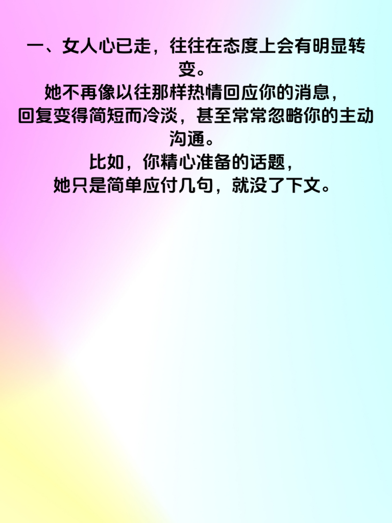 一、女人心已走,往往在态度上会有明显转变。她不再像以往那样热情回应你的消息,回复变得简短而冷淡,甚至常常忽略你的主动沟通。比如,你精心准备的话题,她只是简单应付几句,就没了下文。 二、相处时的肢体语言也会泄露秘密。她不再愿意与你有亲密的接触,刻意保持距离。曾经她会自然地靠在你身边,现在却总是避开你的触碰,好像你是陌生人一般。 三、她开始减少与你相处的时间。不再像以前那样期待和你见面,总是找各种借口推脱约会。即使在一起,也显得心不在焉,眼神飘忽,心思仿佛早就飞到了别处。 四、对于你的事情,她不再关心。你分享的喜悦,她反应平淡;你遇到的困难,她也不再主动询问和安慰。仿佛你的生活与她毫无关联。 五、她对未来的规划里不再有你。以前会憧憬和你一起的日子,现在却只字不提。当你提及未来,她要么沉默,要么转移话题,这表明她的心已经渐渐远离你。