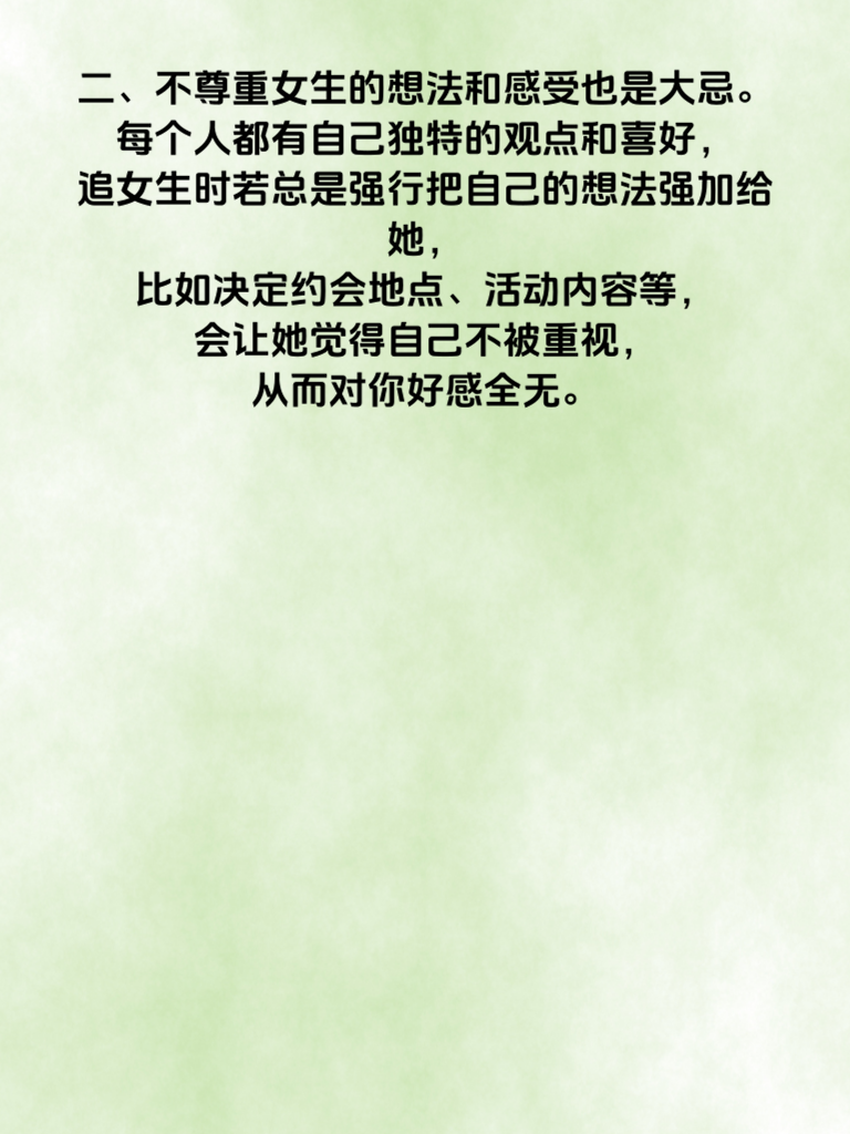 一、追女生时,有些雷区千万碰不得,不然很可能就会追爱失败。首先,过度急切不可取。很多男生一遇到心仪女生,就迫不及待地展开猛烈攻势,每天信息轰炸,频繁邀约。可这样往往会让女生感到压力巨大,产生逃避心理。 二、不尊重女生的想法和感受也是大忌。每个人都有自己独特的观点和喜好,追女生时若总是强行把自己的想法强加给她,比如决定约会地点、活动内容等,会让她觉得自己不被重视,从而对你好感全无。 三、还有,在她面前过度吹嘘自己也非常糟糕。适当展示自己的优点是好的,但要是一味夸大,说自己无所不能,成就非凡,会给人一种很不真实的感觉。女生更欣赏真诚、脚踏实地的男生。所以,追女生时一定要避开这些雷区,用真心和恰当的方式去赢得她的芳心。