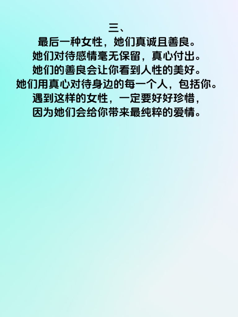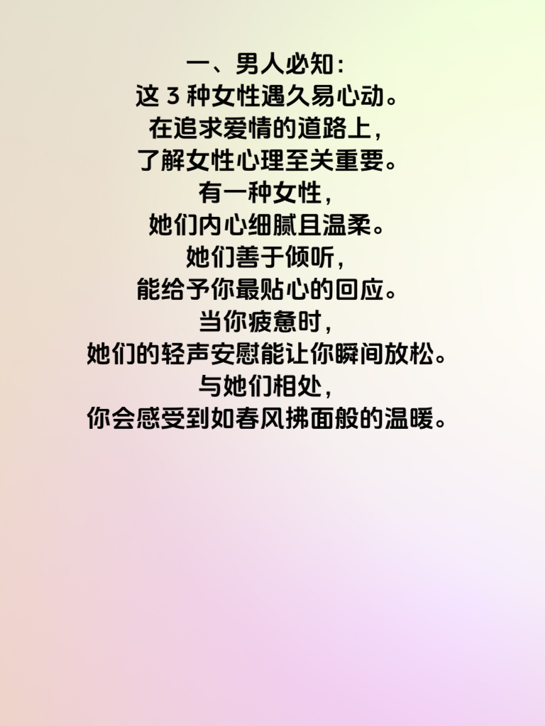 一、男人必知:这3种女性遇久易心动。在追求爱情的道路上,了解女性心理至关重要。有一种女性,她们内心细腻且温柔。她们善于倾听,能给予你最贴心的回应。当你疲惫时,她们的轻声安慰能让你瞬间放松。与她们相处,你会感受到如春风拂面般的温暖。 二、还有一种女性,她们独立又自信。她们有着自己的追求和梦想,不依附他人。她们的自信会感染你,让你也变得更加积极向上。在面对困难时,她们坚韧的态度会激励你勇往直前。和这样的女性在一起,你们能共同成长,互相成就。 三、最后一种女性,她们真诚且善良。她们对待感情毫无保留,真心付出。她们的善良会让你看到人性的美好。她们用真心对待身边的每一个人,包括你。遇到这样的女性,一定要好好珍惜,因为她们会给你带来最纯粹的爱情。