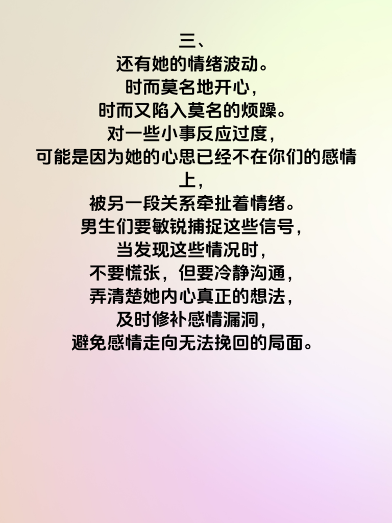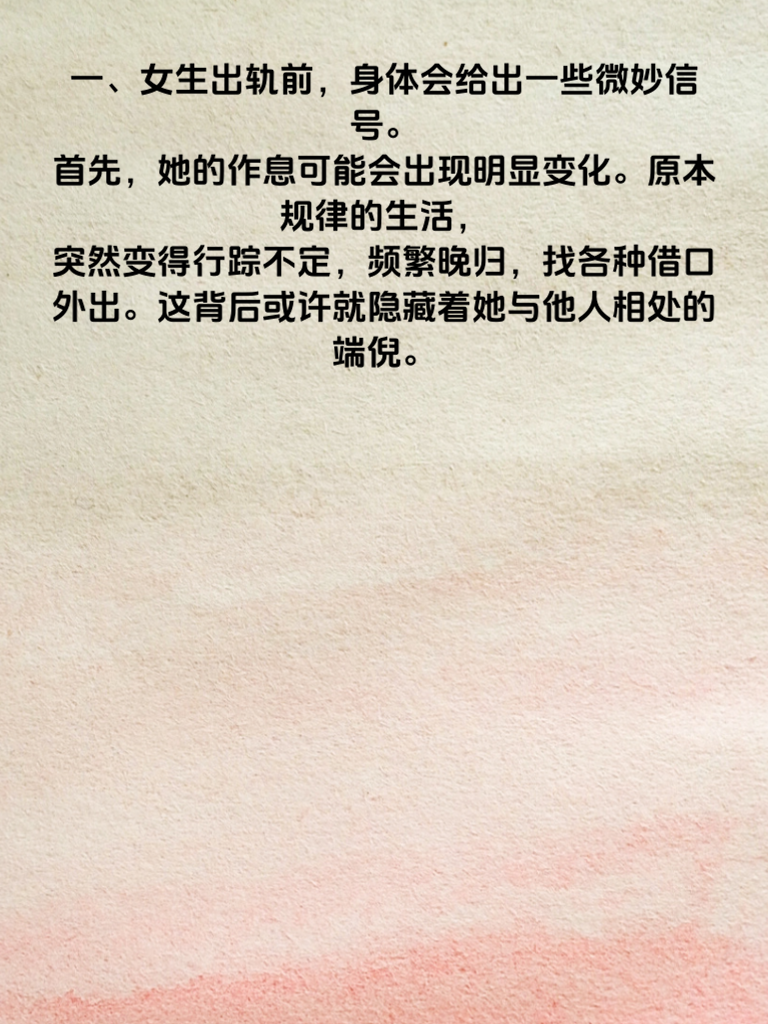一、女生出轨前,身体会给出一些微妙信号。首先,她的作息可能会出现明显变化。原本规律的生活,突然变得行踪不定,频繁晚归,找各种借口外出。这背后或许就隐藏着她与他人相处的端倪。 二、身体语言也会泄露秘密。她可能不再像以往那样与你亲密接触,刻意保持距离,眼神躲闪,避免长时间的对视。这些细微的变化,都可能暗示着她内心的异样。 三、还有她的情绪波动。时而莫名地开心,时而又陷入莫名的烦躁。对一些小事反应过度,可能是因为她的心思已经不在你们的感情上,被另一段关系牵扯着情绪。男生们要敏锐捕捉这些信号,当发现这些情况时,不要慌张,但要冷静沟通,弄清楚她内心真正的想法,及时修补感情漏洞,避免感情走向无法挽回的局面。