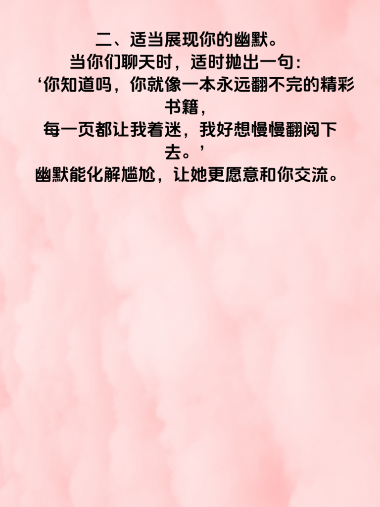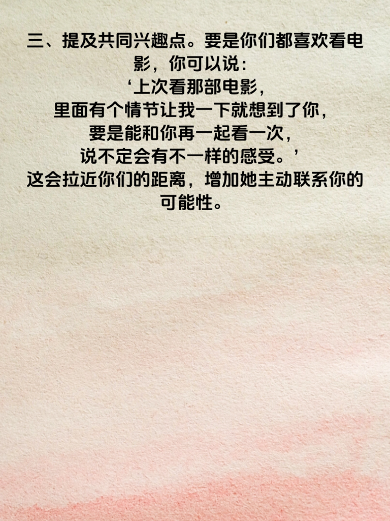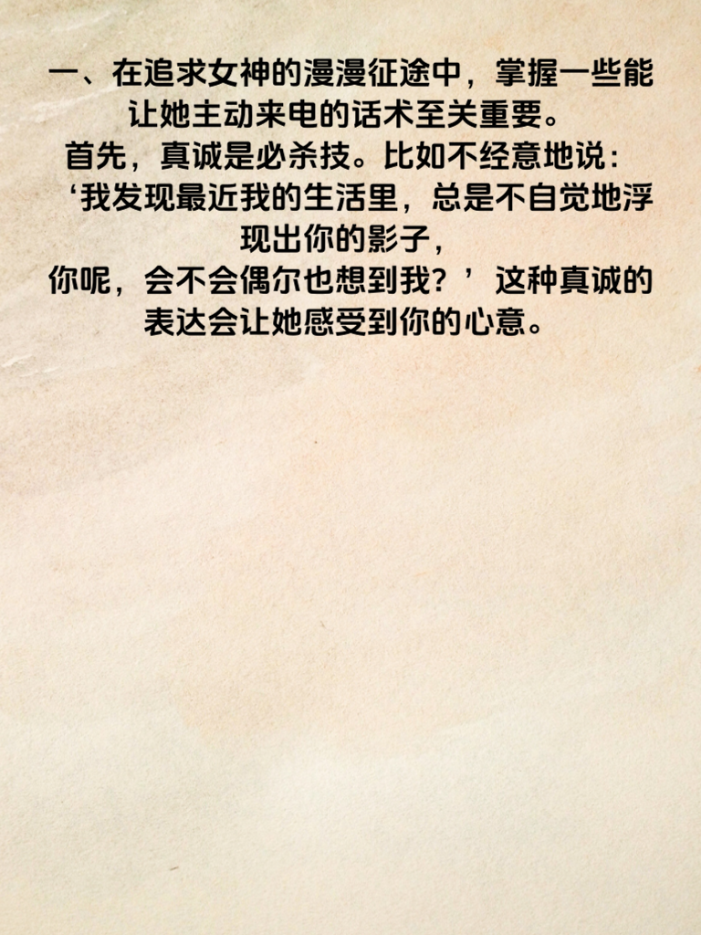 一、在追求女神的漫漫征途中,掌握一些能让她主动来电的话术至关重要。首先,真诚是必杀技。比如不经意地说:‘我发现最近我的生活里总是不自觉地浮现出你的影子,你呢,会不会偶尔也想到我?’这种真诚的表达会让她感受到你的心意。 二、适当展现你的幽默。当你们聊天时,适时抛出一句:‘你知道吗,你就像一本永远翻不完的精彩书籍,每一页都让我着迷,我好想慢慢翻阅下去。’幽默能化解尴尬,让她更愿意和你交流。 三、提及共同兴趣点。要是你们都喜欢看电影,你可以说:‘上次看那部电影,里面有个情节让我一下就想到了你,要是能和你再一起看一次,说不定会有不一样的感受。’这会拉近你们的距离,增加她主动联系你的可能性。 四、偶尔来点小赞美,但要恰到好处。不要过于浮夸,真诚地说:‘你今天这个发型很适合你,显得你更加俏皮可爱了。’让她知道你在关注她,欣赏她。如此,或许就能开启她主动给你来电的心动篇章。