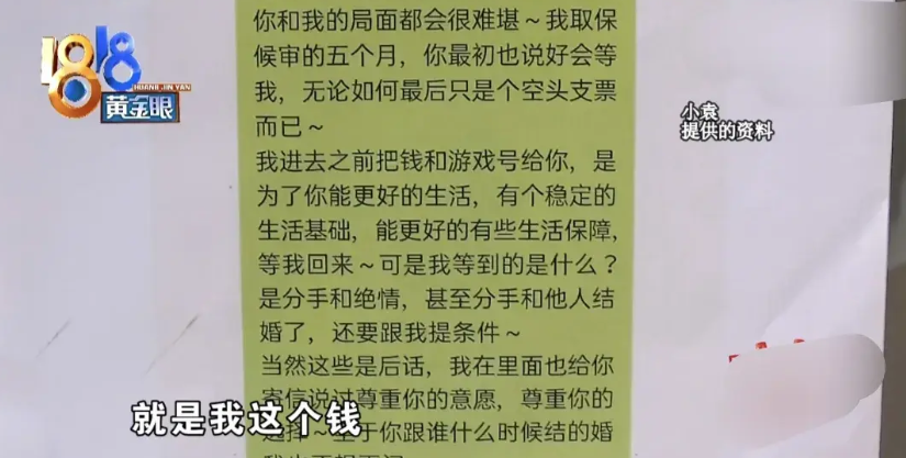 1818黄金眼报道,2025年七八月份,90后的小袁从监狱出来了,手里没钱,也没有手机,他在手机店,借了老板电话给前女友小应,问她要钱。