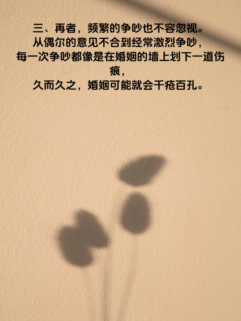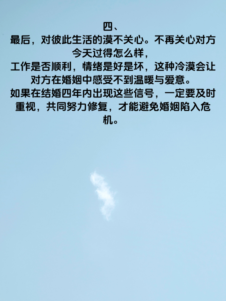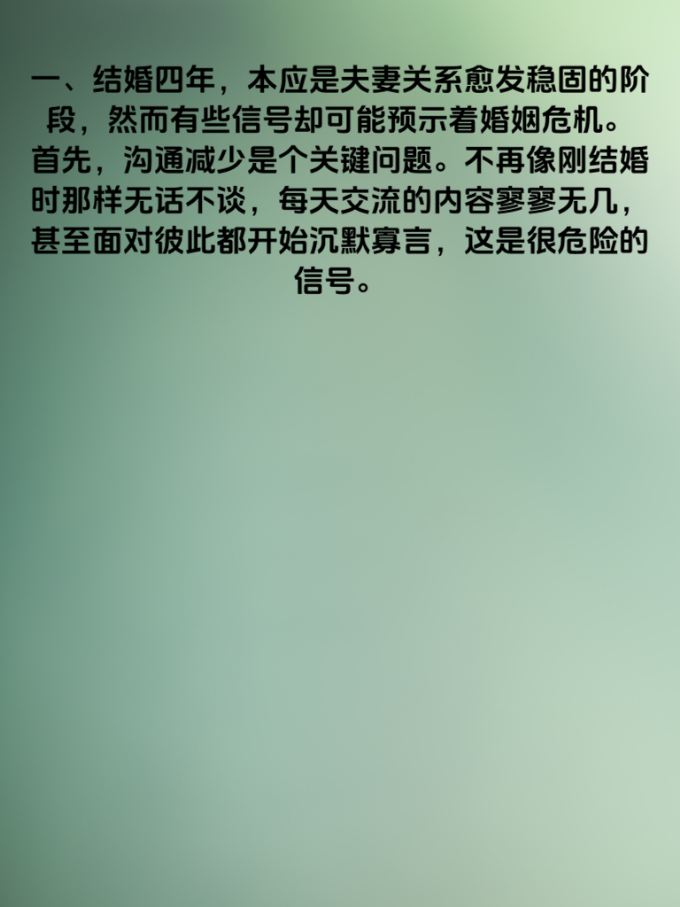 一、结婚四年,本应是夫妻关系愈发稳固的阶段,然而有些信号却可能预示着婚姻危机。首先,沟通减少是个关键问题。不再像刚结婚时那样无话不谈,每天交流的内容寥寥无几,甚至面对彼此都开始沉默寡言,这是很危险的信号。 二、其次,夫妻间的亲密感下降。以前的拥抱、亲吻变得越来越少,身体上的距离似乎也在逐渐拉大,这种亲密关系的疏离,往往意味着感情出现了隔阂。 三、再者,频繁的争吵也不容忽视。从偶尔的意见不合到经常激烈争吵,每一次争吵都像是在婚姻的墙上划下一道伤痕,久而久之,婚姻可能就会千疮百孔。 四、最后,对彼此生活的漠不关心。不再关心对方今天过得怎么样,工作是否顺利,情绪是好是坏,这种冷漠会让对方在婚姻中感受不到温暖与爱意。如果在结婚四年内出现这些信号,一定要及时重视,共同努力修复,才能避免婚姻陷入危机。