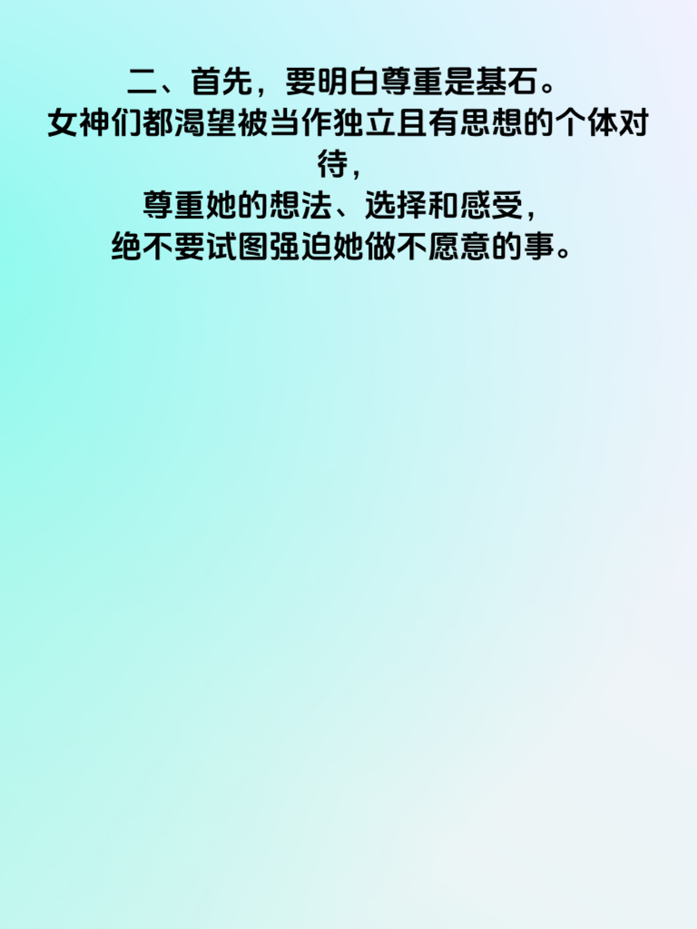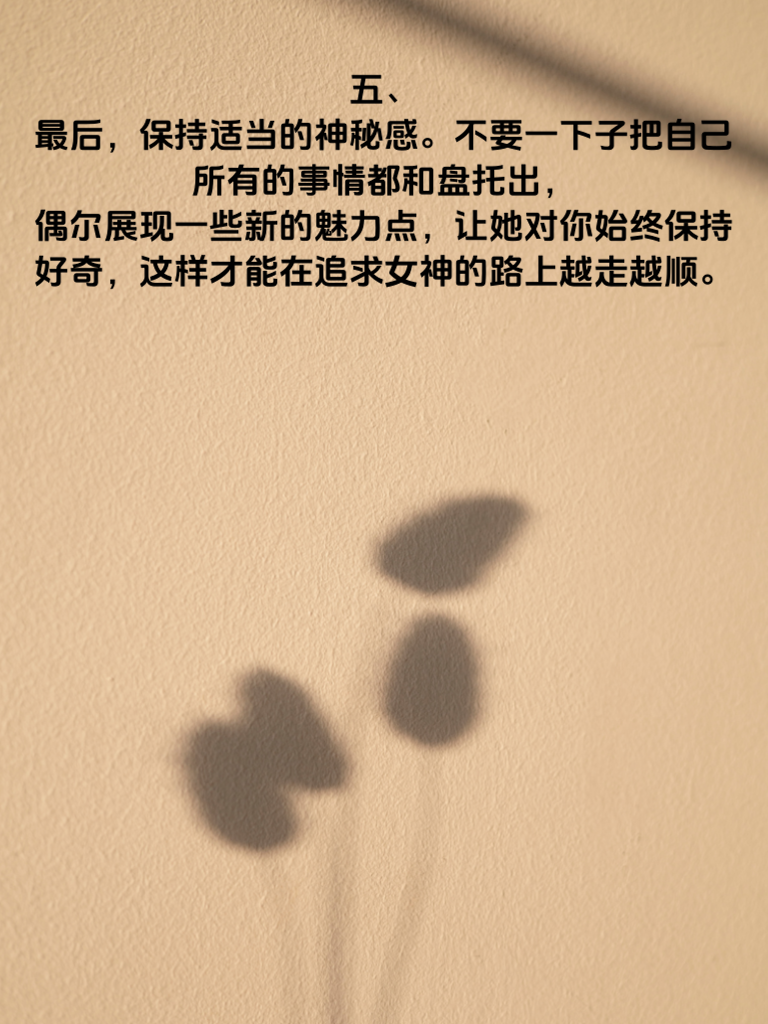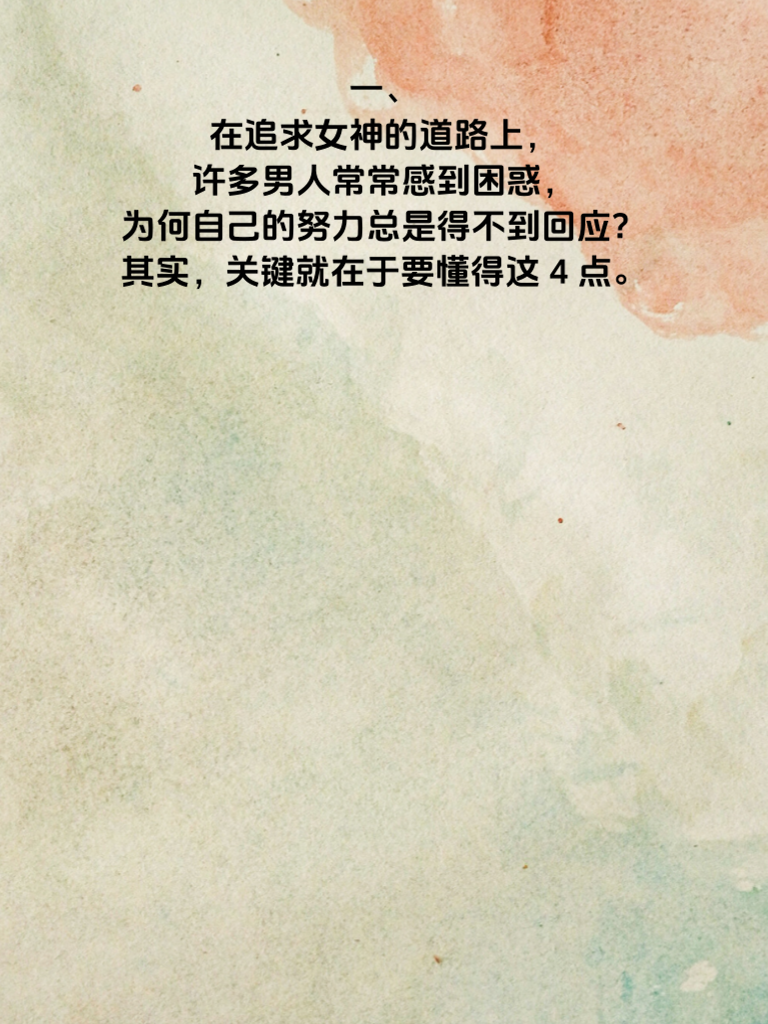 一、在追求女神的道路上,许多男人常常感到困惑,为何自己的努力总是得不到回应?其实,关键就在于要懂得这4点。 二、首先,要明白尊重是基石。女神们都渴望被当作独立且有思想的个体对待,尊重她的想法、选择和感受,绝不要试图强迫她做不愿意的事。 三、再者,真诚是必杀技。虚情假意或许能一时蒙混过关,但长久不了。用真心去对待她,让她感受到你对她的在乎并非只是说说而已。 四、了解她的兴趣爱好也至关重要。当你知晓她喜欢什么,就能与她有更多共同话题,更容易拉近彼此距离。比如她爱读书,你可以和她聊聊最近读的好书。 五、最后,保持适当的神秘感。不要一下子把自己所有的事情都和盘托出,偶尔展现一些新的魅力点,让她对你始终保持好奇,这样才能在追求女神的路上越走越顺。