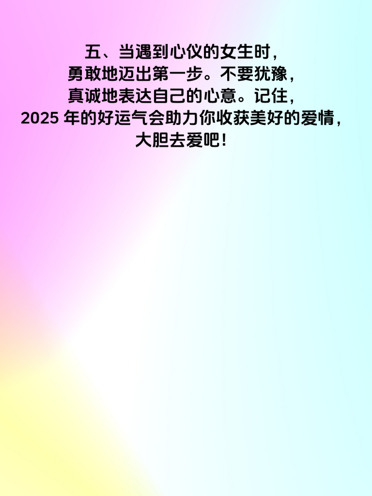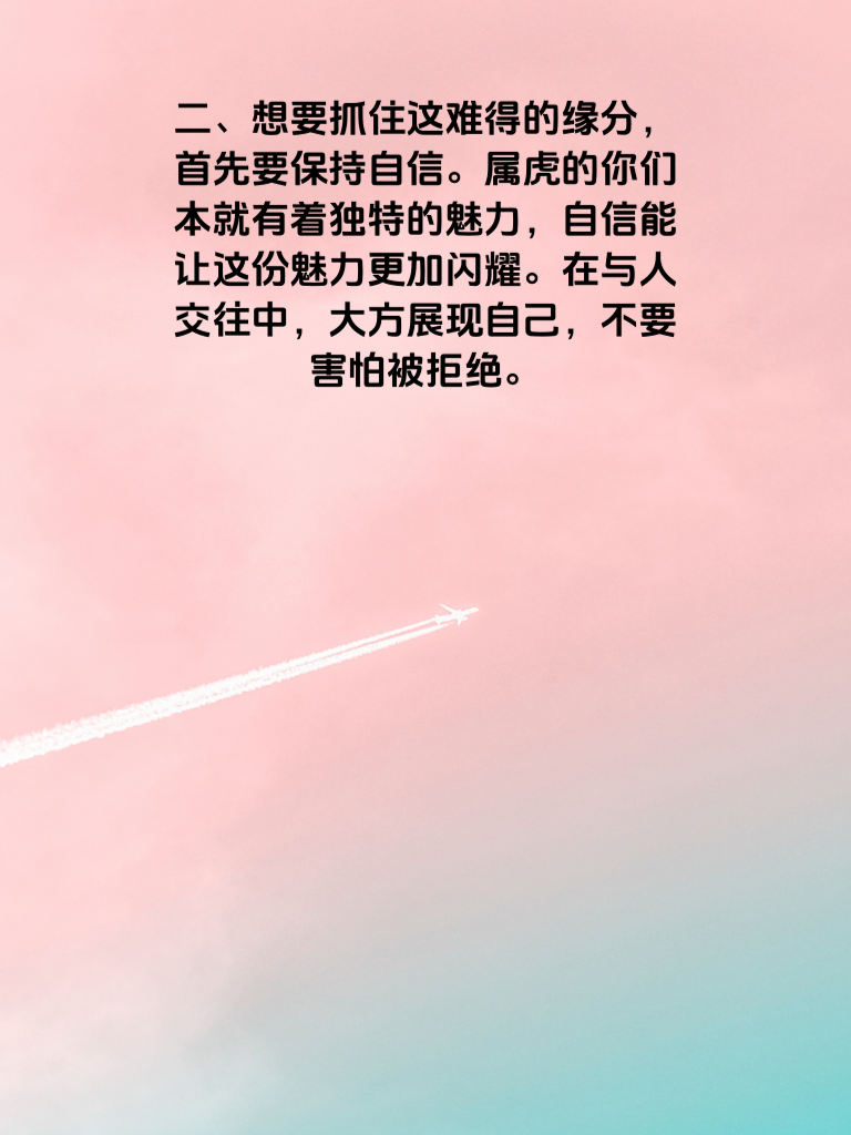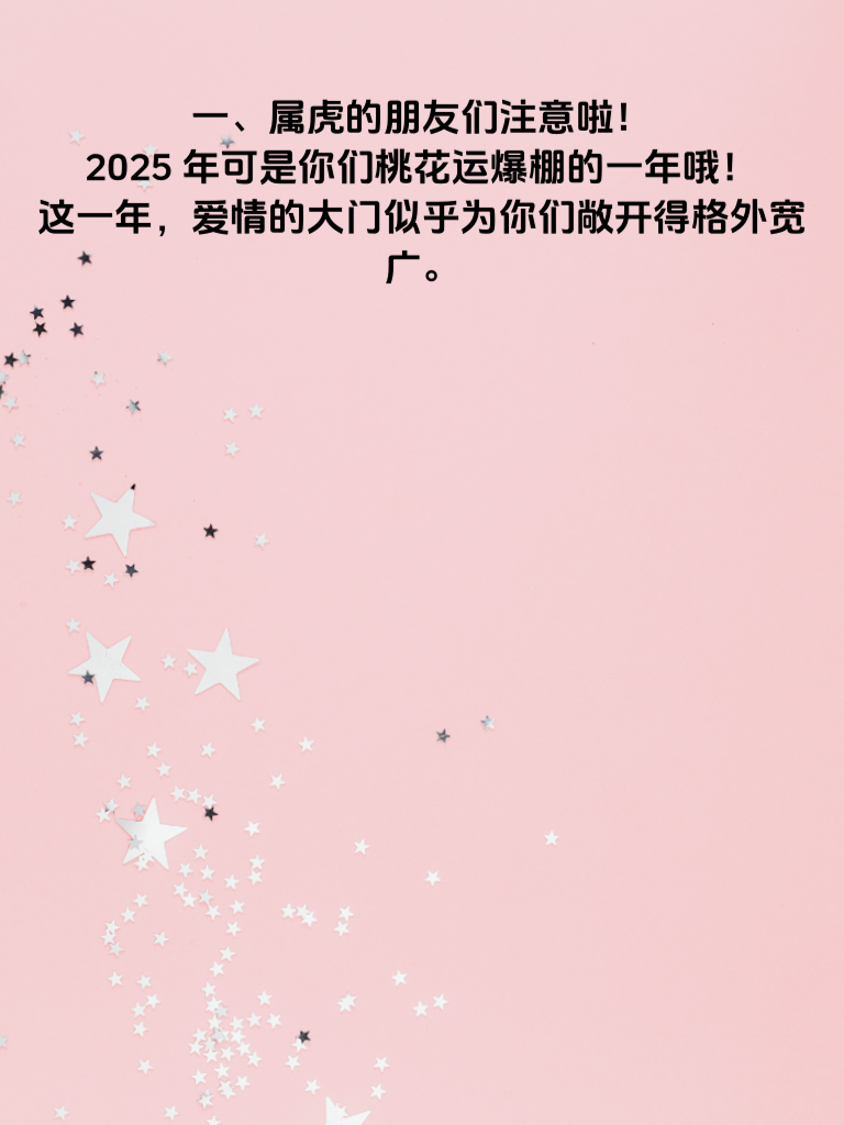 一、属虎的朋友们注意啦!2025年可是你们桃花运爆棚的一年哦!这一年,爱情的大门似乎为你们敞开得格外宽广。 二、想要抓住这难得的缘分,首先要保持自信。属虎的你们本就有着独特的魅力,自信能让这份魅力更加闪耀。在与人交往中,大方展现自己,不要害怕被拒绝。 三、积极拓展社交圈子也很关键。参加各种活动,结识不同的人,说不定那个特别的她就在某个转角等着你。主动与人交流,真诚待人,会让你更容易收获好感。 四、注重自身形象也必不可少。干净整洁的外表、得体的穿着,会给人留下良好的第一印象。同时,不断提升内在修养,让自己更有内涵,这样才能长久吸引心仪的女生。 五、当遇到心仪的女生时,勇敢地迈出第一步。不要犹豫,真诚地表达自己的心意。记住,2025年的好运气会助力你收获美好的爱情,大胆去爱吧!