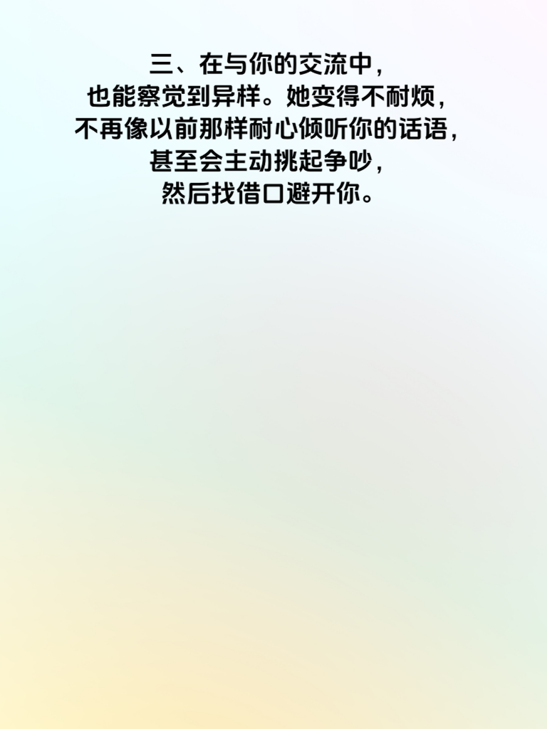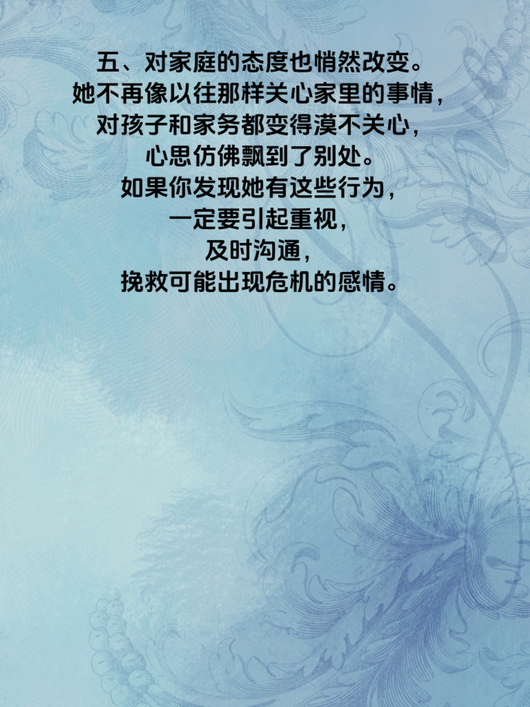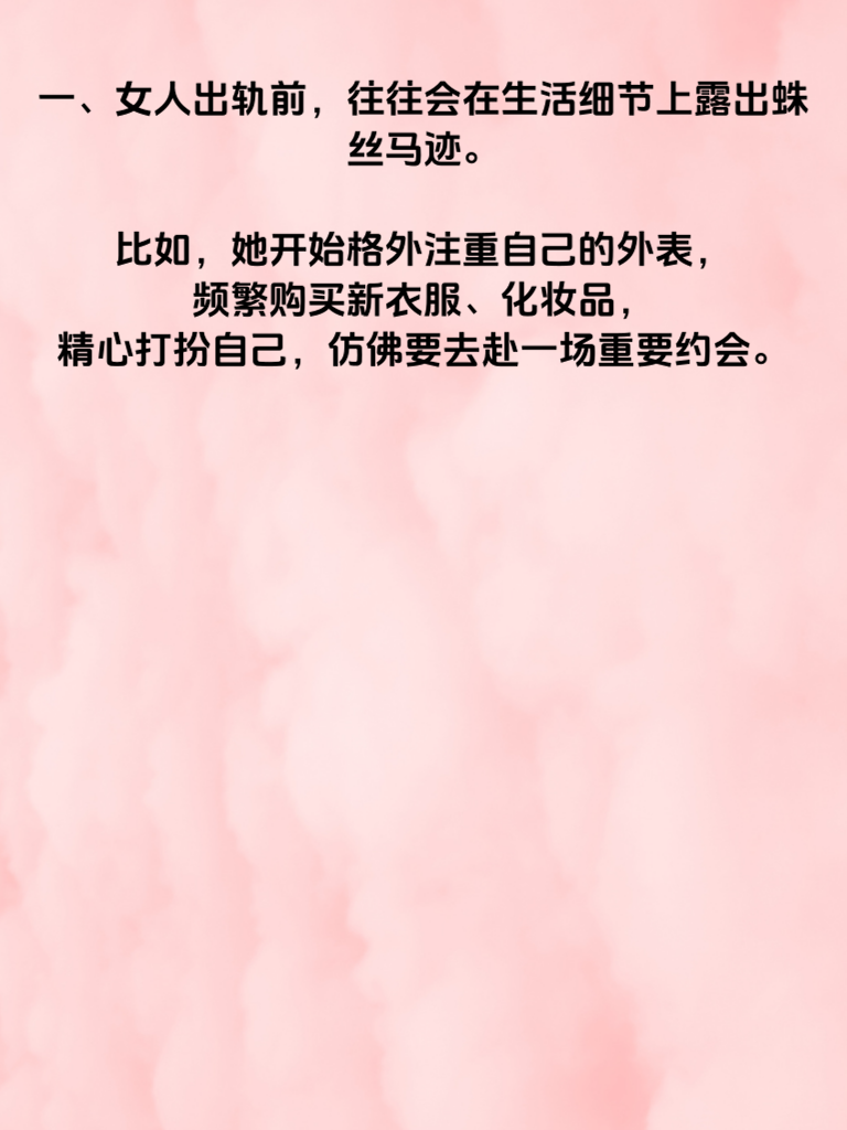 一、女人出轨前,往往会在生活细节上露出蛛丝马迹。比如,她开始格外注重自己的外表,频繁购买新衣服、化妆品,精心打扮自己,仿佛要去赴一场重要约会。 二、日常行为也会有所变化。她可能会突然变得很忙,频繁加班或者参加各种社交活动,而且对这些活动的细节总是含糊其辞,不愿过多提及。 三、在与你的交流中,也能察觉到异样。她变得不耐烦,不再像以前那样耐心倾听你的话语,甚至会主动挑起争吵,然后找借口避开你。 四、手机成为了她的“宝贝”,总是小心翼翼地保护着,不让你触碰。接电话或者回信息时,会刻意避开你,神色也变得慌张。 五、对家庭的态度也悄然改变。她不再像以往那样关心家里的事情,对孩子和家务都变得漠不关心,心思仿佛飘到了别处。如果你发现她有这些行为,一定要引起重视,及时沟通,挽救可能出现危机的感情。