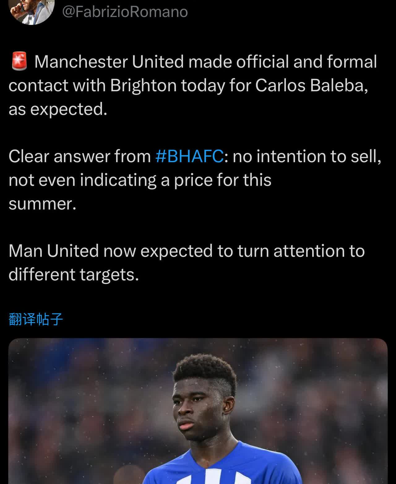 早就说了,别相信自媒体的消息。 之前我转几个靠谱的媒体,他们都说:今夏曼联没机会签下巴莱巴,结果一群人留言说我扯淡,因为很多媒体已经报道基本成交了,甚至有人说已经1.12亿成交[捂脸] 🔴曼联与布莱顿就卡洛斯·巴莱巴一事进行了正式接触。 🔵布赖顿的明确回答:今年夏天没有出售的意图,甚至没有表明价格。 🔴曼联现在预计将把注意力转向不同的目标