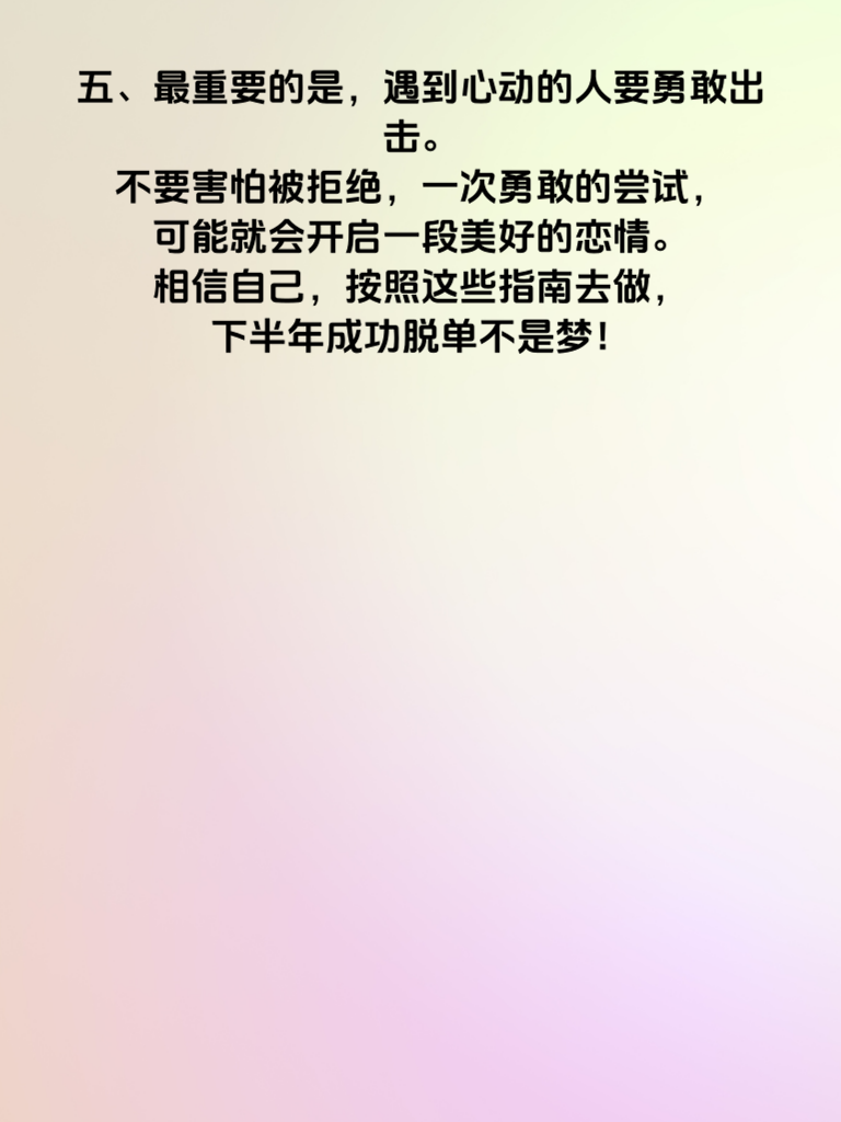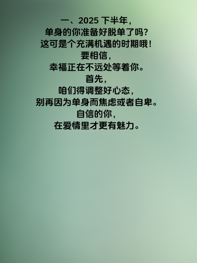一、2025 下半年,单身的你准备好脱单了吗?这可是个充满机遇的时期哦!要相信,幸福正在不远处等着你。首先,咱们得调整好心态,别再因为单身而焦虑或者自卑。自信的你,在爱情里才更有魅力。 二、扩大社交圈是关键一步。别总是宅在家里,多参加一些自己感兴趣的活动,比如读书俱乐部、户外运动小组等等。在这些场合,更容易遇到志同道合的人,缘分说不定就在不经意间降临。 三、学会展示自己的优点。每个人都有闪光点,要善于在与人交往中展现出来。但也别过度吹嘘,真诚才是必杀技。聊天时,大方分享自己的爱好、梦想,让对方看到真实又有趣的你。 四、提升自身形象也不容忽视。保持良好的生活习惯,注重外表整洁得体。不需要多么奢华的打扮,干净清爽就很加分。内在修养同样重要,多读书、多学习,丰富自己的内涵,这样在恋爱中才能有更多的话题可聊。 五、最重要的是,遇到心动的人要勇敢出击。不要害怕被拒绝,一次勇敢的尝试,可能就会开启一段美好的恋情。相信自己,按照这些指南去做,下半年成功脱单不是梦!