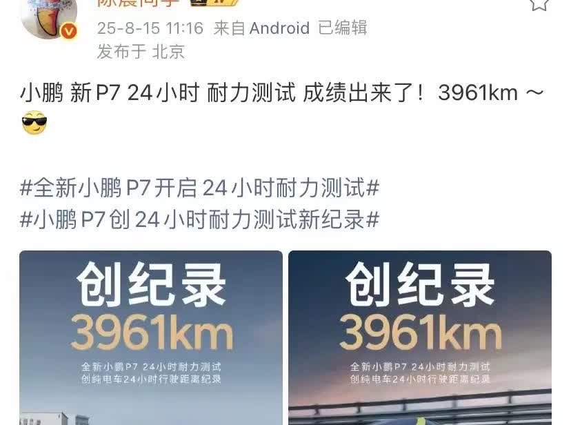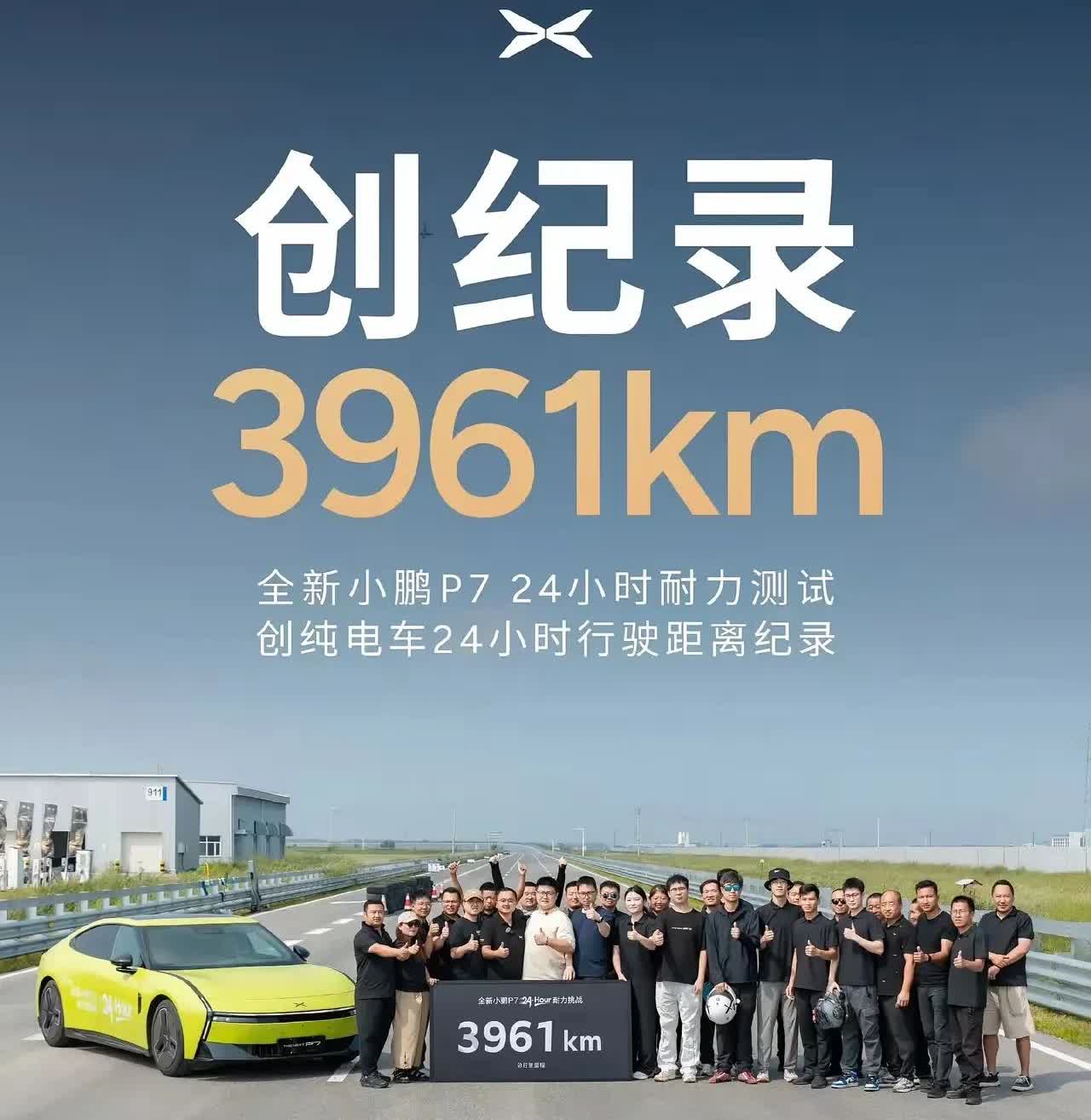 陈震发言车圈又传来好消息! 小鹏汽车又创造新的记录,全新小鹏P724小时耐力测试,创造了纯电动车24小时行驶距离记录,这次总里程行驶了3961km的记录,记得上次还是小米YU7做这个耐力测试,距离仅仅才3944km,比小鹏汽车远远低了17km,没想到小鹏汽车这么勇猛,又一次刷新了自己的记录,开纯电车再也没有续航焦虑了!