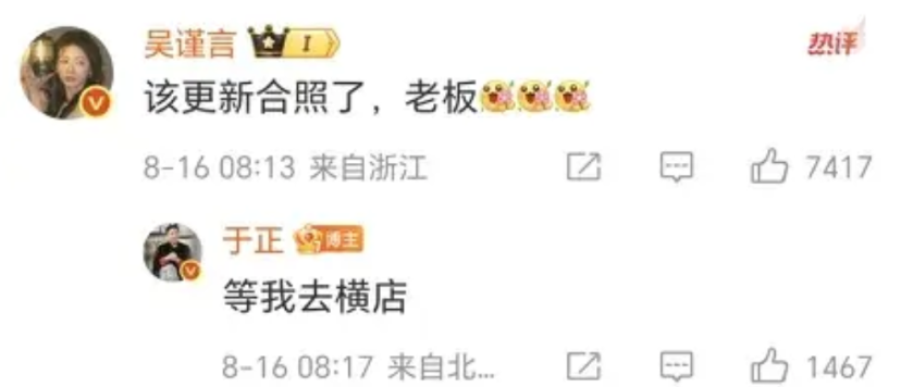 吴谨言回复于正该更新合照了! 8月16日00:00,于正卡点在社交平台晒出了N宫