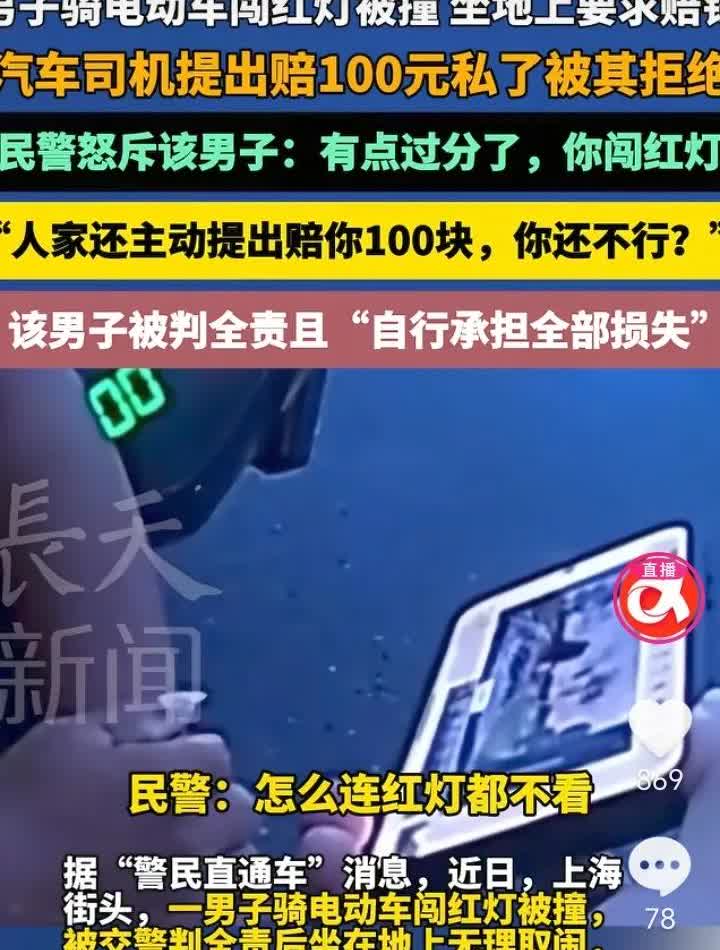 得寸进尺!上海,一男子骑车闯红灯被撞,被判全责后坐在地上无理取闹企图免责,说自己