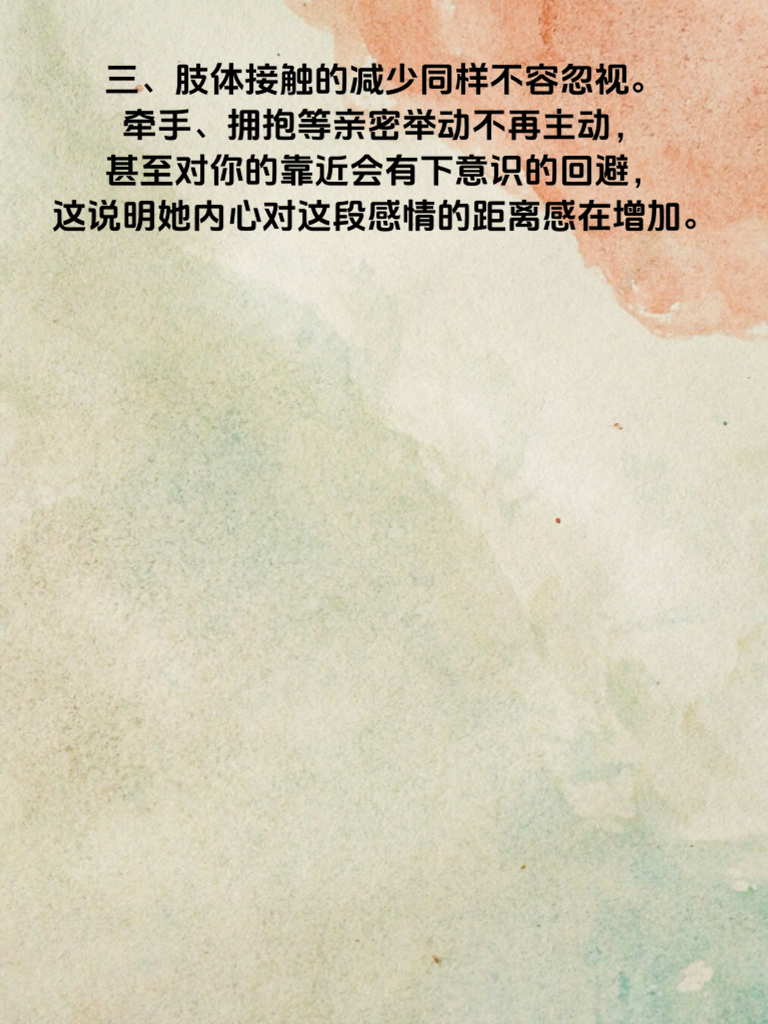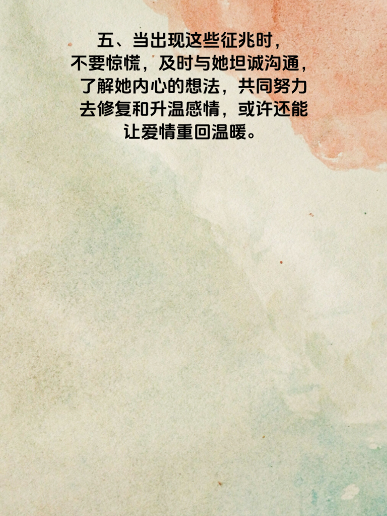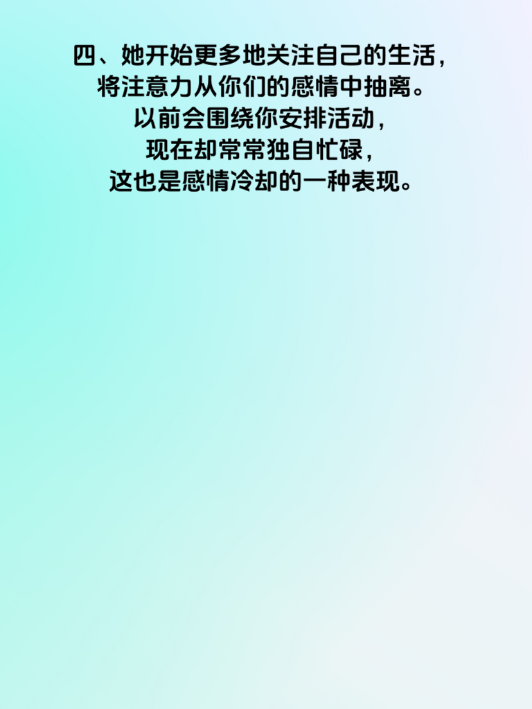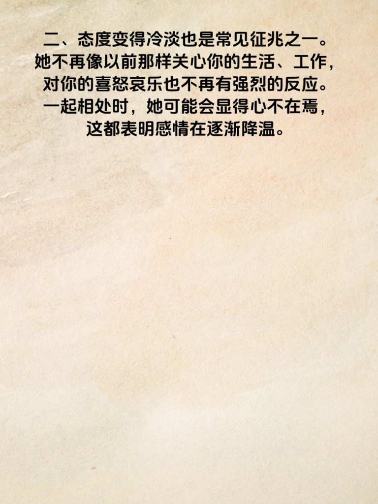 一、感情冷却并非毫无预兆,了解女性心理中感情冷却的征兆,能帮助我们更好地应对感情问题。首先,沟通频率明显降低是一个关键信号。曾经无话不谈,如今却常常相对无言,回复信息也变得敷衍,这往往意味着她对这段感情的热情在减退。 二、态度变得冷淡也是常见征兆之一。她不再像以前那样关心你的生活、工作,对你的喜怒哀乐也不再有强烈的反应。一起相处时,她可能会显得心不在焉,这都表明感情在逐渐降温。 三、肢体接触的减少同样不容忽视。牵手、拥抱等亲密举动不再主动,甚至对你的靠近会有下意识的回避,这说明她内心对这段感情的距离感在增加。 四、她开始更多地关注自己的生活,将注意力从你们的感情中抽离。以前会围绕你安排活动,现在却常常独自忙碌,这也是感情冷却的一种表现。 五、当出现这些征兆时,不要惊慌,及时与她坦诚沟通,了解她内心的想法,共同努力去修复和升温感情,或许还能让爱情重回温暖。