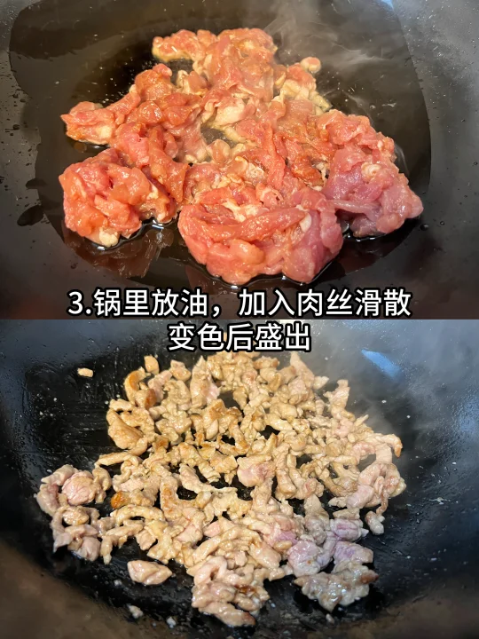 3、锅里放油,加入肉丝滑散,变色后盛出