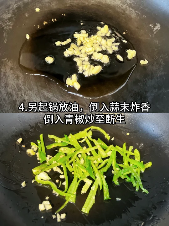 4、另起锅放油,倒入蒜末炸香,倒入青椒炒至断生