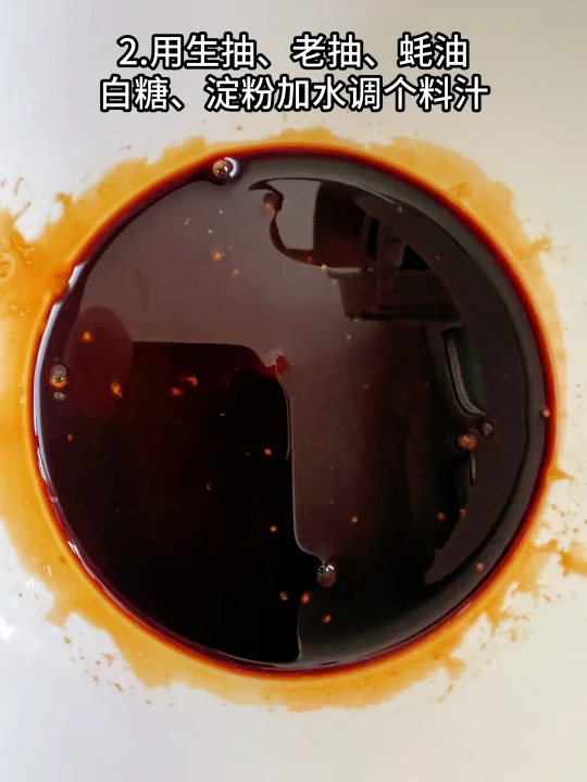2、用生抽、老抽、蚝油、白糖、淀粉加水调个料汁