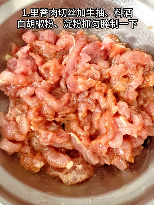 1、里脊肉切丝加生抽、料酒、白胡椒粉、淀粉抓匀腌制一下