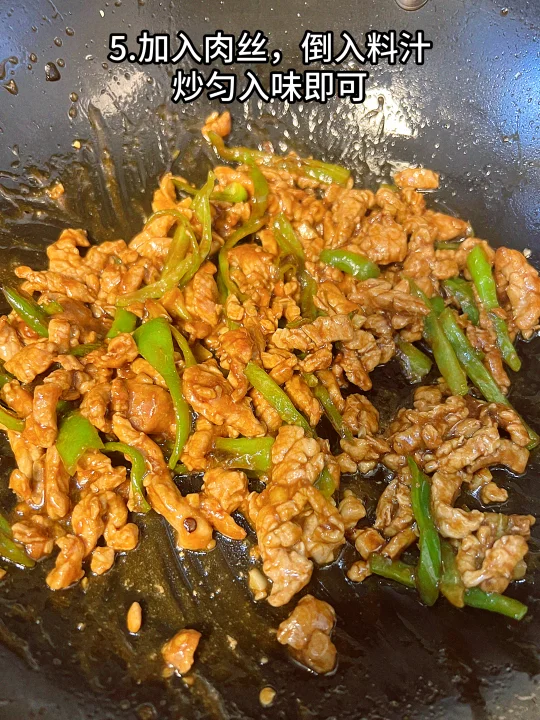 5、加入肉丝,倒入料汁,炒匀入味即可