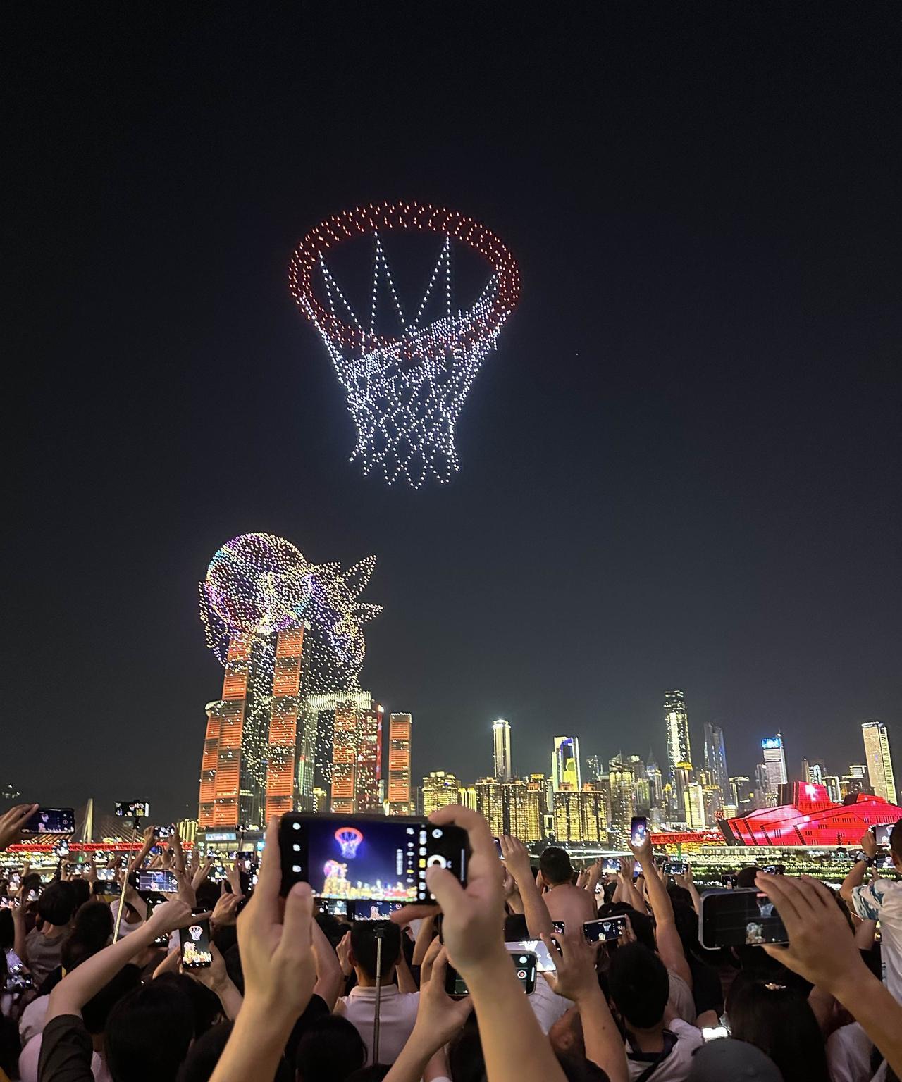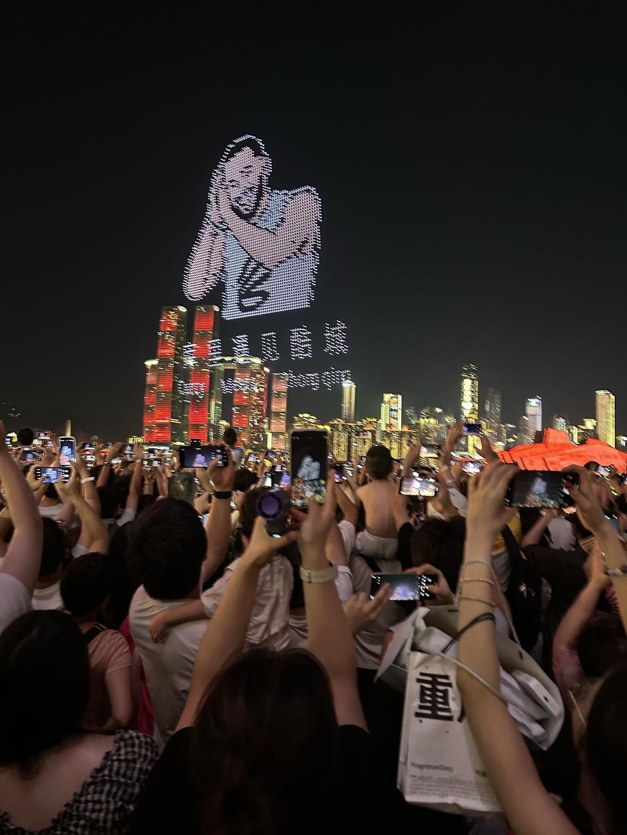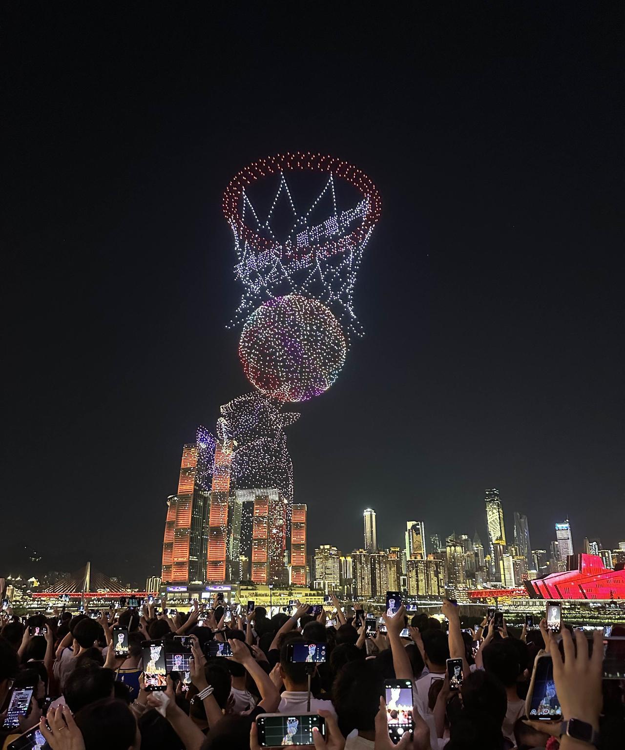 啊!重庆这么热的天,依旧人山人海啊!8月18日晚上8点半,库里中国行无人机灯光秀