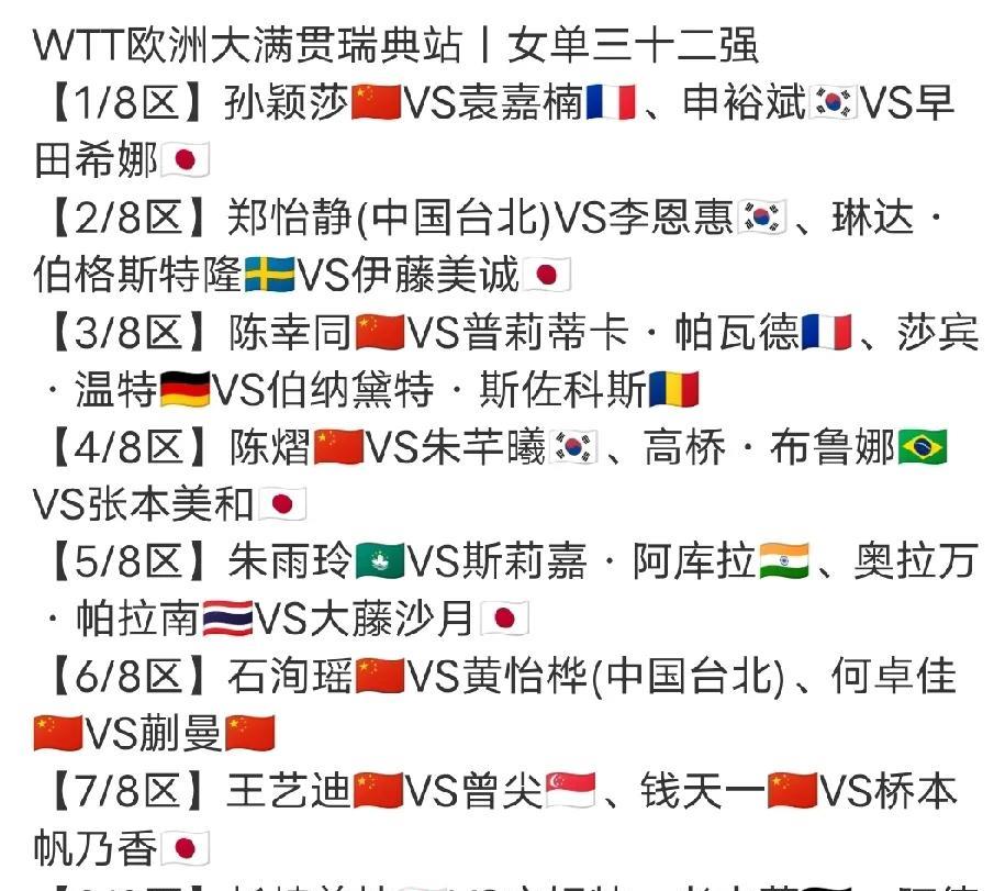 女单32强全部产生 2025WTT欧洲大满贯瑞典站女单32强全部产生,1/16决赛对阵见附图,其中国乒女队对阵如下: 1.孙颖莎VS袁嘉楠 2.陈幸同VS帕瓦德 3.陈熠VS朱芊曦 4.石洵瑶VS黄怡桦 5.何卓佳VS蒯曼 6.王艺迪VS曾尖 7.钱天一VS桥本帆乃香 8.王曼昱VS迪亚兹 1/32决赛,国乒女队表现非常强势,9人出战9人晋级!1/16决赛,对手越来越强,其中还有佳佳与蒯曼的内战,各位加油!