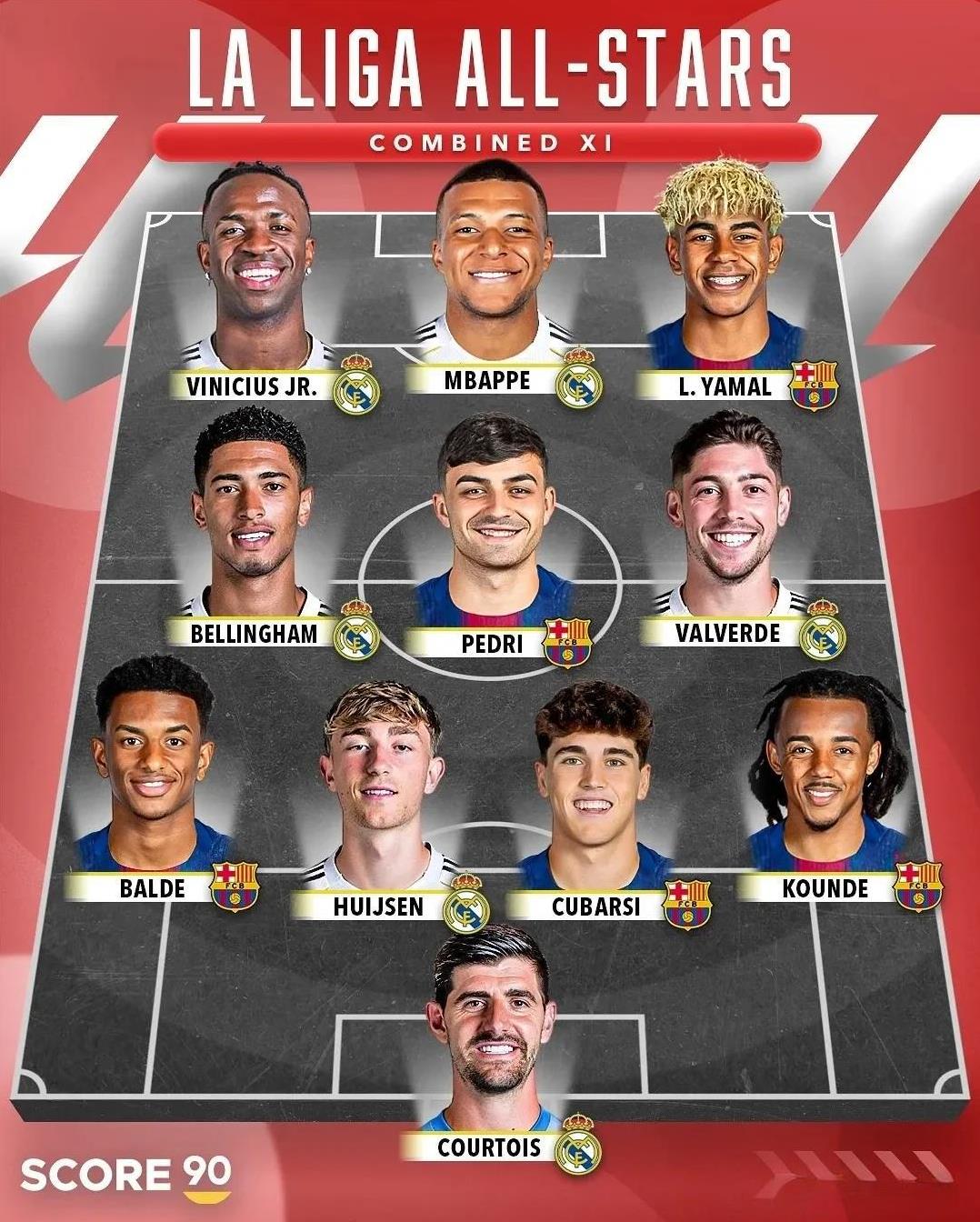 当现役的英超全明星对上西甲的全明星,两回合制,你觉得谁会赢? 英超全明星 前锋:萨卡(阿森纳),哈兰德(曼城),萨拉赫(利物浦) 中场:帕尔默(切尔西),罗德里(曼城),赖斯(阿森纳) 后卫:萨瓦迪奥尔(曼城),范戴克(利物浦),萨利巴(阿森纳),廷贝尔(阿森纳) 门将:阿利松(利物浦) —————————————————————— 西甲全明星 前锋:维尼休斯(皇马),姆巴佩(皇马),亚马尔(巴萨) 中场:贝林厄姆(皇马),佩德里(巴萨),巴尔韦德(皇马) 后卫:巴尔德(巴萨),赫伊森(皇马),库巴西(巴萨),孔德(巴萨) 门将:库尔图瓦(皇马) 你更看好英超还是西甲? #英超# #激情灵魂,大爱西甲# #英超明星# #西甲明星足球队# #足球明星赛# #巨星球员对比# #球星实力对比# #足坛巨星对比# #足坛璀璨明星#