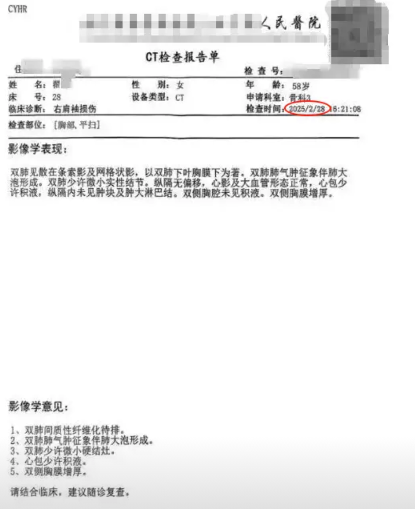 2025年2月,翟女士不小心摔伤了肩膀,前往医院检查,医生诊断后要求她做手术,随后翟女士就去拍了片子。