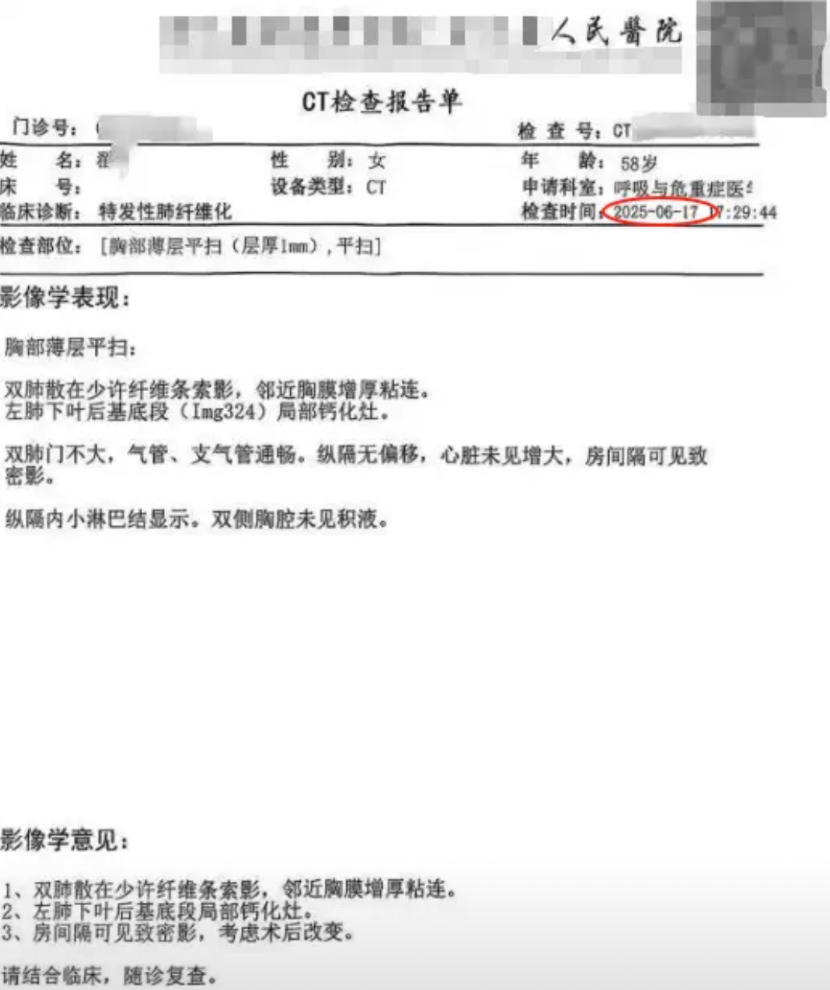 “冤不冤!”四川成都,一女子因摔伤到医院拍CT检查,结果显示,女子肺部出现“双肺间质性纤维化待排”,属于一种慢性绝症!此后,女子按照医生的要求服用了3个月的药,等到去医院拍片复查时,却发现女子的病竟然好了!经过核查,之前的结果是其他患者的。网友:太没有责任心了!