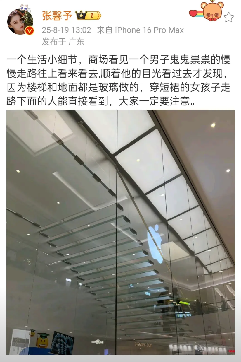 张馨予贴心发文,提醒女孩子穿短裙走这种透明的楼梯一定要注意,张馨予真是太细心太暖了吧! 张馨予文中称,自己逛商场的时候看到一名男子,一直慢慢走路往上看来看去,顺着目光望去,发现了这个透明的楼梯…… 看张馨予拍的这张照片,应该是特意等了一会,没有人路过才拍的,真是太有心了!