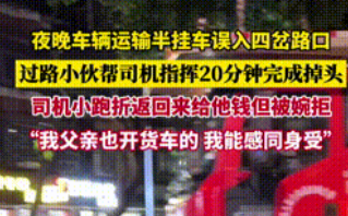 这小伙必成大器!”浙江宁波,一半挂车深夜误入四岔路口,因为路窄车多,司机完全没法掉头!就在他正发愁时,一小伙主动上前指挥20多分钟,最终帮助司机成功掉头!为感谢小伙,司机小跑下车给钱,可没想到小伙直接拒绝,而他接下来的话也让人暖心!网友:这就是中华好儿郎! "不用了,我父亲也是开货车的,我知道你们不容易!"小伙感慨道,一场看似普通的交通困境,却因一位年轻人的善举,成为了全网热议的暖心故事。 那是一个寻常的夜晚,浙江宁波的四岔路口灯火通明,一辆庞大的半挂车因不熟悉路况,误入了这个狭窄的路口,司机师傅很快发现,在这个车流密集、空间有限的路口,想要掉头几乎是不可能完成的任务。 车身太长,转弯半径不足,加上夜间视线不佳,每一次尝试都以失败告终,随着时间的推移,被堵住的车辆越来越多,司机师傅的额头渗出了细密的汗珠,焦急写在脸上,就在这时,正在路口等红绿灯的小曹注意到了这一幕,他仔细观察了一下情况,立刻判断出。 仅凭司机一人之力,根本无法完成这次高难度的掉头操作,更令人担忧的是,夜色渐深,视野越发不清,继续僵持下去不仅会造成更严重的交通堵塞,还可能引发安全事故,没有丝毫犹豫,小曹主动走上前去,向司机表示愿意提供帮助。 小曹的指挥专业而有序,他首先疏导了各个方向的车辆,为半挂车创造尽可能大的操作空间,小曹的指令清晰而及时,司机师傅在小曹的指挥下,小心翼翼地操作着这个庞然大物,二十多分钟过去了,在两人默契的配合下,半挂车终于完成了这个看似不可能的任务,成功掉头驶离了困境路口。 看到半挂车顺利离开被堵的车辆也陆续通行,小曹准备默默离开,然而感激不尽的司机师傅却小跑着追了上来,从口袋里掏出钱来想要酬谢这位热心的年轻人,面对这份心意,小曹却连连摆手拒绝,"不用了,我父亲也是开货车的,我知道你们不容易!" 原来小曹的父亲就是一名常年奔波在路上的货车司机,他深知这个职业的艰辛与不易,风餐露宿、长途跋涉、与家人聚少离多,这些都是货车司机的日常,正因如此当他看到同行遇到困难时,才会毫不犹豫地伸出援手,这份理解与共情,比任何金钱酬谢都更加珍贵。 这起暖心事件很快在网络上传播开来,引发了广大网友的热议,许多网友被小曹的善举所感动,有网友表示:"这才是真正的正能量!小伙不仅帮助了司机,更用实际行动诠释了'理解'与'共情'的深刻含义,在这个浮躁的社会,这样的善举如同一股清流,让人倍感温暖。" 另一位网友则表示:"小曹的行为看似偶然,实则必然,他的家庭教育培养出了这份善良与同理心,'我父亲也是开货车的'这句话背后,是对劳动者最朴素的尊重和最真挚的理解,这种精神品质,正是我们社会最需要弘扬的,希望这样的善举能够激励更多人,让温暖在人与人之间传递。" 这起发生在宁波四岔路口的暖心事件,不仅是一次简单的助人为乐,更展现了当代年轻人的责任担当和人文关怀,小曹用实际行动证明,善良并不需要惊天动地,它往往就体现在这些平凡而细微的举动中,他的那句"我父亲也是开货车的",道出了最朴素也最动人的同理心。 对此你怎么看?欢迎大家在评论区留言讨论。