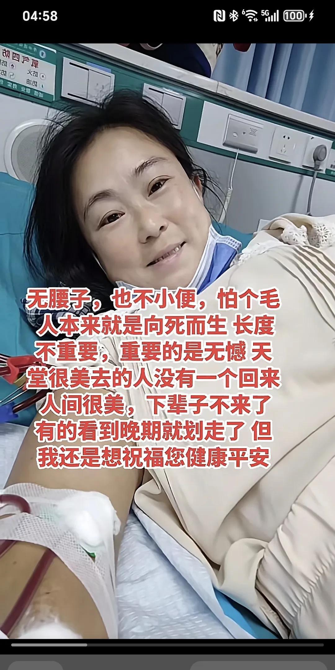 无腰子,也不小便,怕个毛,人本来就是向死而生,长度不重要,重要的事无遗憾,天堂很美去的人没一个回来,人间很美下辈子不来了,有的看到晚期的就划走,但我还是祝福你平安健康~ 妹子,生命的宽度是你当下看开后快乐的园地,我们毕竟有限,把握不了的事索性顺其自然,高高兴兴每一天! 坚持别气馁,听说有一种人造的肾脏,马上就要上市了,说不定你能等到呢。心态放好,面向快乐人生,你一定会好起来的。 乐观开朗的美女,一切都看开,心态决定命运,相信好运降临在你身上,别怕,没事,好好活着吧[祈祷][祈祷][祈祷]#世上没啥了不起# #天堂没有大病痛# #天堂无病#