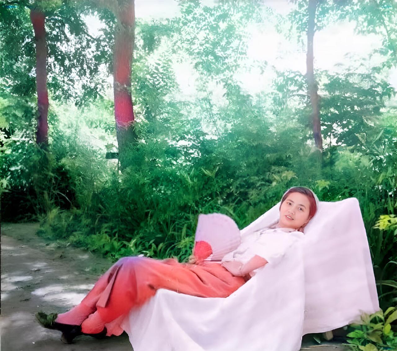 这位手持折扇,躺在林间藤椅上,颜值超高的女子正是陈老总的夫人张茜。1956年的夏