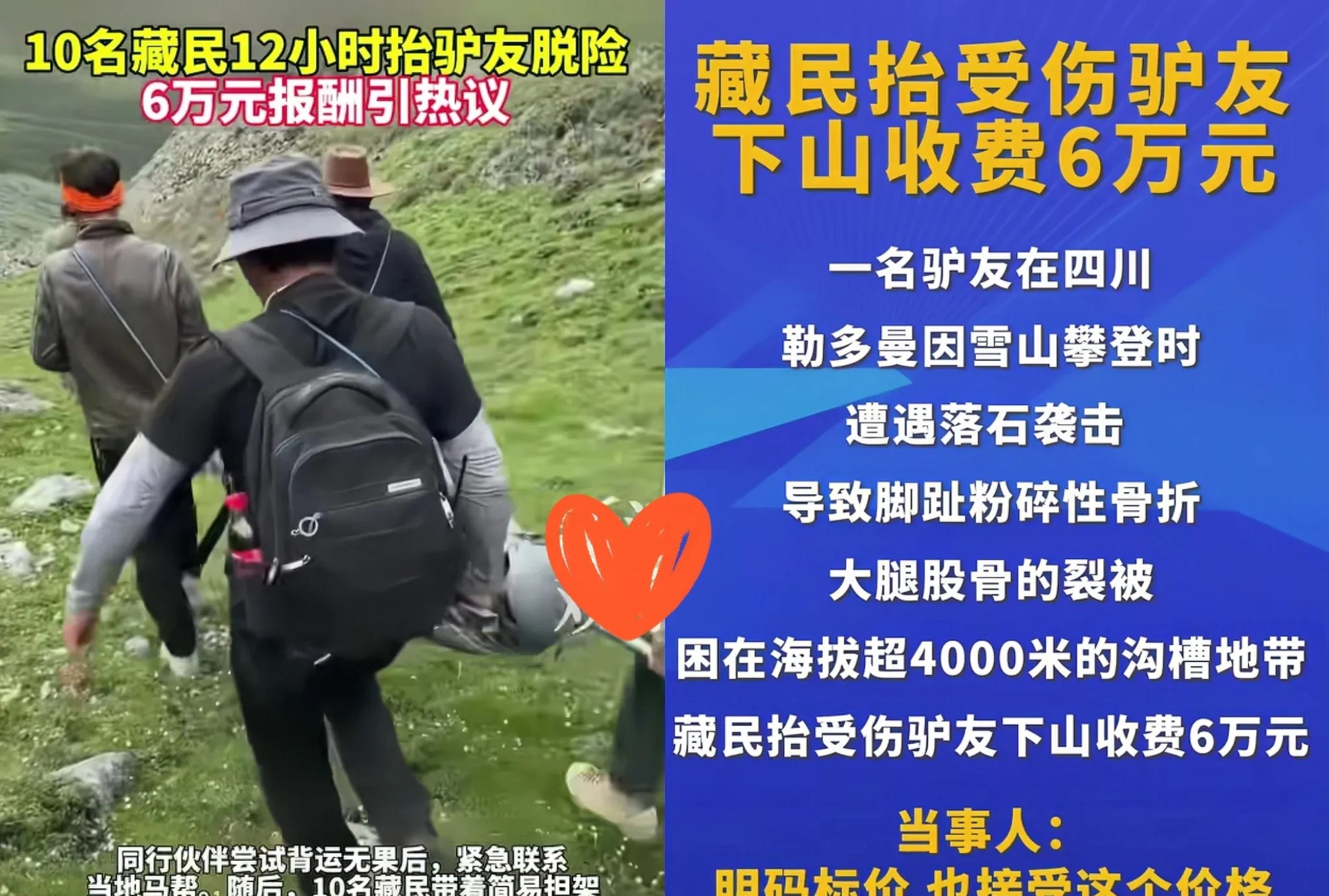 我猜到被藏民救下的驴友会感恩, 也猜到他会报答, 万万没想到,他居然还给藏民送了锦旗“高原脊梁,生命之光”。 一位驴友在徒步旅行中遭遇落石,重伤昏迷。头部受了伤,应该是流血不止的那种,身上还有其他伤。驴友同伴打电话给当地藏民,让他们把驴友背下山。 藏民看到了驴友的伤势很严重,背不下去就得让他死在山上,所以收了六万块钱,分了六个人走一趟。这是驴友和藏民达成的协议。可是这六个人也没想到,他们将面临怎样的挑战。 这六个藏民背着70公斤重的驴友,走走停停,艰难地往下爬。他们有的用手指撕下驴友的衣服,用衣服包扎驴友的伤口;有的用嘴撕开驴友的裤子,用裤子包扎驴友的腿伤…… 就这样他们抬着单架,下山用了12个小时。 有网友评论:这六个藏民真是汉子!拿命在悬崖上抬人,十二小时山路血都渗衣服了,六万摊下来没剩多少,这救命情分比钱金贵,真该被记一辈子! 也有的说:这钱收得不应该呀!救人一命胜造七级浮屠!不是吗? 这话说的我就不乐意了!你说这付钱的也愿意,收钱的也愿意!双方都心甘情愿,咋就不应该了!咱凭本事挣钱,心里踏实;做人干净,活得敞亮,这才是真本事!