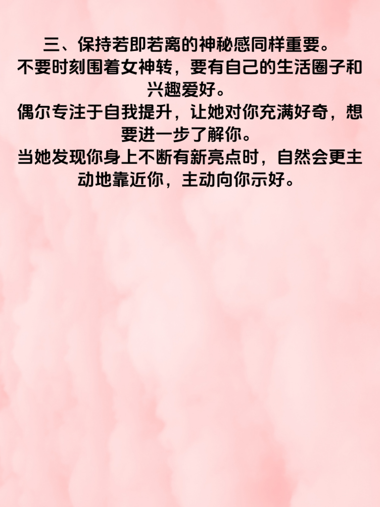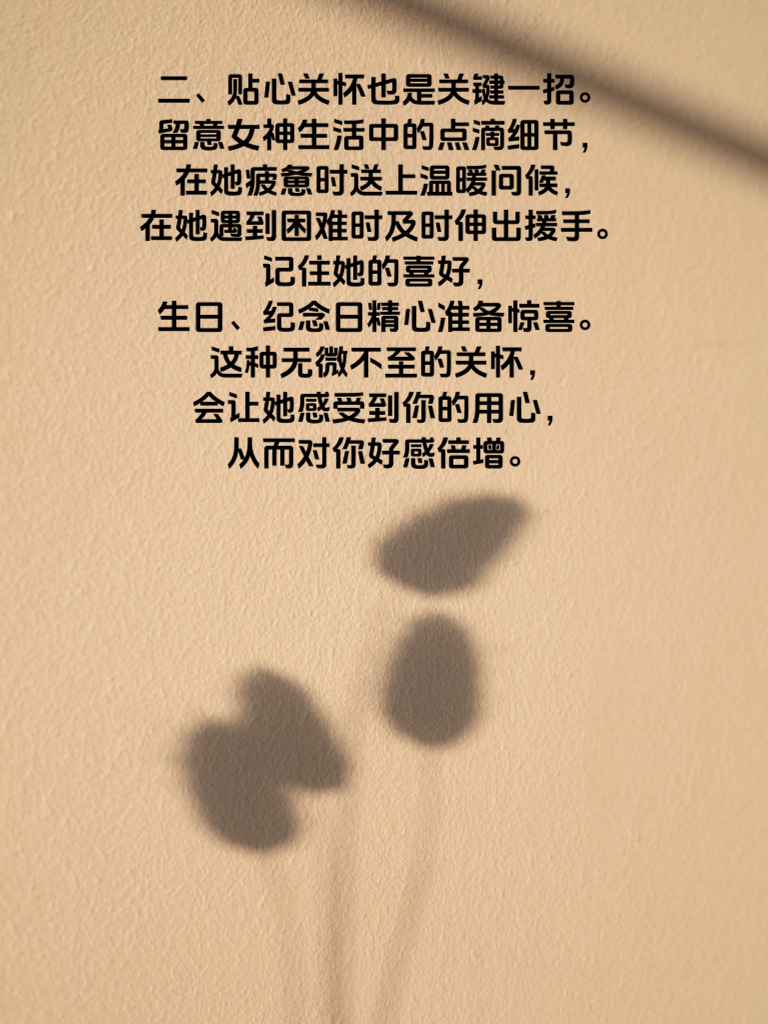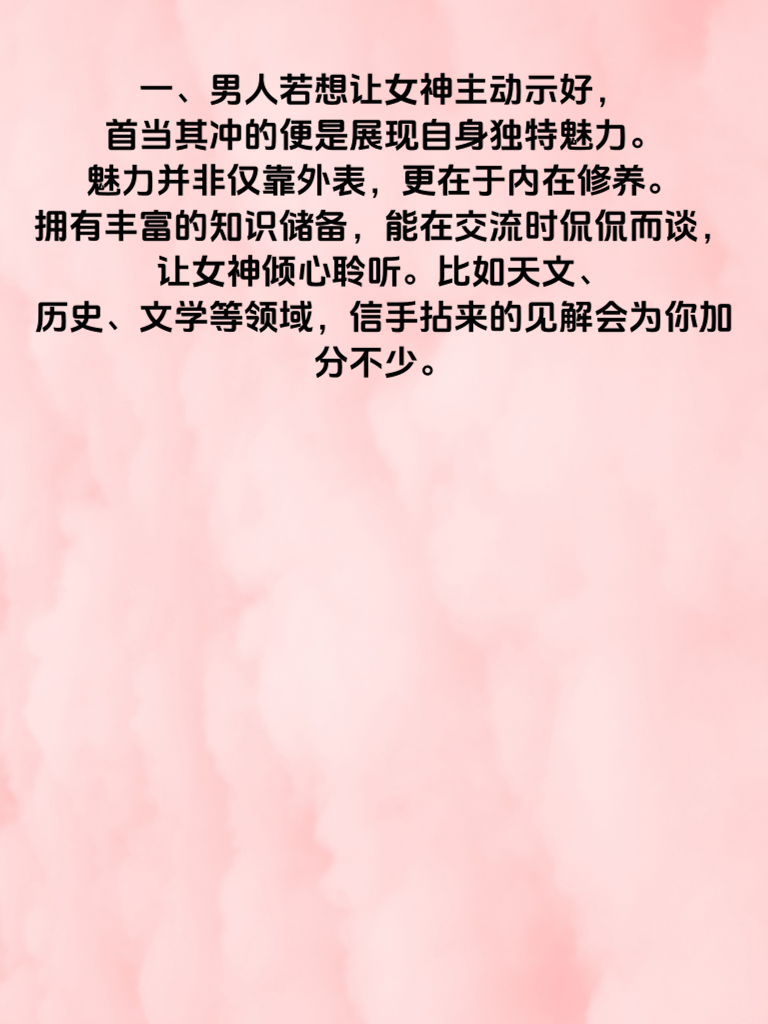 一、男人若想让女神主动示好,首当其冲的便是展现自身独特魅力。魅力并非仅靠外表,更在于内在修养。拥有丰富的知识储备,能在交流时侃侃而谈,让女神倾心聆听。比如天文、历史、文学等领域,信手拈来的见解会为你加分不少。 二、贴心关怀也是关键一招。留意女神生活中的点滴细节,在她疲惫时送上温暖问候,在她遇到困难时及时伸出援手。记住她的喜好,生日、纪念日精心准备惊喜。这种无微不至的关怀,会让她感受到你的用心,从而对你好感倍增。 三、保持若即若离的神秘感同样重要。不要时刻围着女神转,要有自己的生活圈子和兴趣爱好。偶尔专注于自我提升,让她对你充满好奇,想要进一步了解你。当她发现你身上不断有新亮点时,自然会更主动地靠近你,主动向你示好。