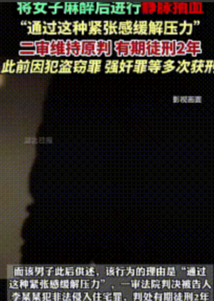他在药店非法获取了一些麻醉药物,配合一块黑布,将俞女士迷晕后,再使用压脉带和针管对她进行静脉抽血。