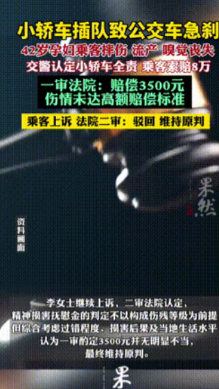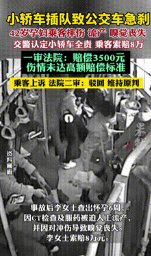 “悲剧还是发生了!”上海,42岁女子搭乘公交车时,因为一位女司机强行插队,公交车司机不得不采取急刹车,结果造成女子摔到了头部,怀孕6周的胎儿也跟着流产!气愤的女子起诉女司机和公交司机,要求获得8万的精神损失费,最终法院这样判了! 那天傍晚,李女士和平常一样搭乘着公交车,就在车辆平稳行驶在熟悉的线路上时,突然,一辆轿车从右侧强行切入公交车前方。 看到这一幕,司机赶紧采取刹车,可这一下也让站着的乘客剧烈摇晃,李女士的头部也因此撞上了栏杆。 起初只是觉得头晕,李女士并没太在意,直到医院告诉她肚子里的孩子已经6周了,结果这个意外之喜还没让她高兴多久,医生就带来了坏消息。 因为头部CT检查的辐射量和服用的药物,已经对胎儿造成了不可逆的伤害,更令人心痛的是,这次撞击还损伤了她的嗅觉神经,从此再也闻不到任何气味。 而交警部门的责任认定很明确,轿车司机负全部责任,但法律的判决却让李女士难以接受,虽然医疗费等实际支出得到了赔偿,但那8万却只获得了3500元,因为法院认为,李女士的损失没有达到高额精神赔偿的标准。 这场事故改变了一个家庭的生活轨迹,一个违规变道的瞬间,不仅带走了一个珍贵的生命,也让一位母亲永远失去了感受孩子气息的机会。