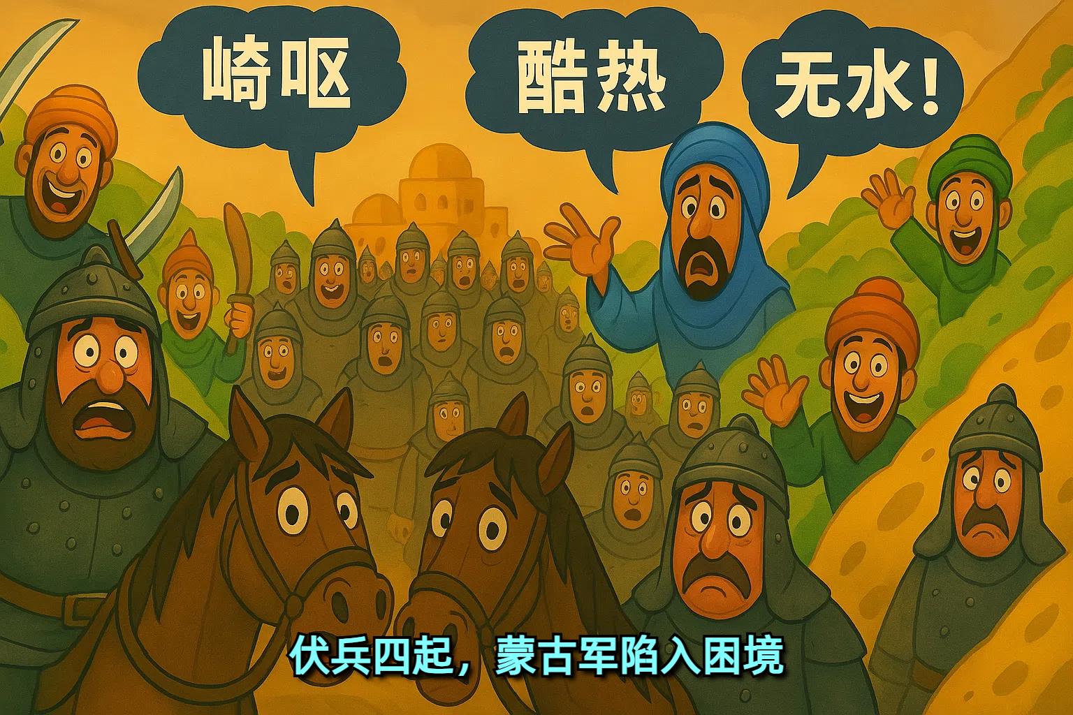 从高地杀出的马穆鲁克伏兵,如潮水般,淹没了蒙古前锋,左右加以夹击。一时间蒙古阵型陷入混乱,指挥出现失灵。更为要命的是,远离水源且补给不够通畅的蒙古战马,已显出疲态,士兵也在极为炎热的环境中,快速失去了体力方面的优势。地形、气候、水源成为压垮这支军队的三座无形的大山。