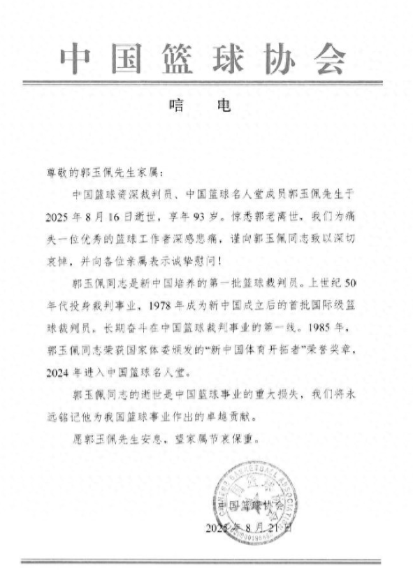 中国篮球协会发布消息: 沉痛悼念中国篮球资深裁判员郭玉佩同志 郭玉佩同志是新中国培养的第一批篮球裁判员。上世纪50年代投身裁判事业,1978年成为新中国成立后的首批国际级篮球裁判员,长期奋斗在中国篮球裁判事业的第一线。1985年,郭玉佩同志荣获国家体委颁发的“新中国体育开拓者”荣誉奖章,2024年进入中国篮球名人堂。 郭玉佩同志的逝世是中国篮球事业的重大损失,我们将永远铭记他为我国篮球事业作出的卓越贡献。