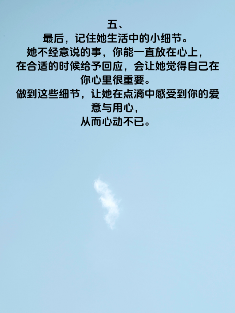 一、细节,往往是打动女生芳心的关键密码。男生们,若想让心仪的女生心动,这4个细节可要牢记。 二、首先,注重她的喜好。用心去了解她喜欢的电影、音乐、书籍等,当你们交流时,能准确地说出她的心头好,她会瞬间觉得你很懂她。比如,知道她喜欢某部电影,一起看时适时分享感受,能让她倍感温暖。 三、再者,留意她的情绪变化。她开心时陪她欢笑,她难过时默默陪伴倾听。一个拥抱、一句安慰,都能让她在脆弱时有依靠。 四、然后,约会中的细节也至关重要。提前规划好行程,准时赴约,为她拉椅子、开车门等小举动,尽显绅士风度。 五、最后,记住她生活中的小细节。她不经意说的事,你能一直放在心上,在合适的时候给予回应,会让她觉得自己在你心里很重要。做到这些细节,让她在点滴中感受到你的爱意与用心,从而心动不已。