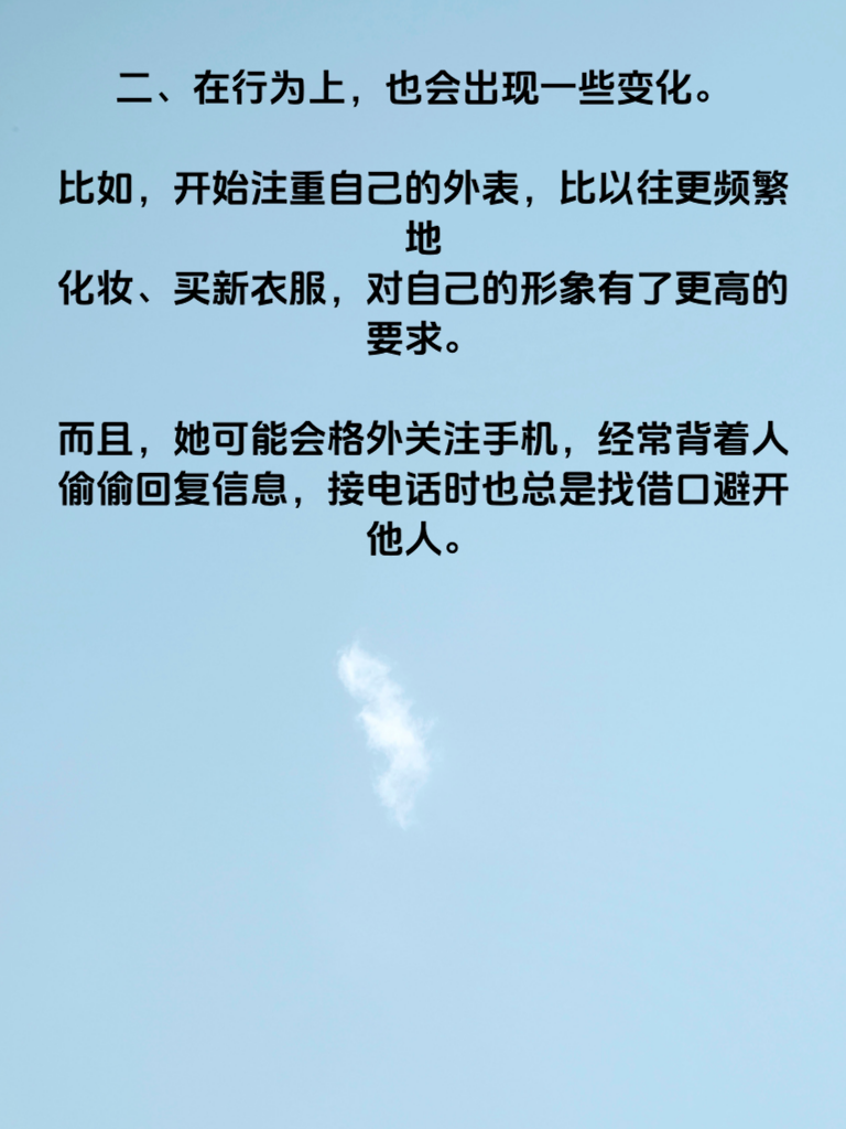 一、中年女性出轨,往往并非毫无征兆。首先,她们的情绪可能会变得极不稳定。平日里温柔贤淑的她,突然频繁地莫名发火,对琐事斤斤计较,或者常常陷入莫名的低落情绪中,这背后或许就隐藏着情感的波澜。 二、在行为上,也会出现一些变化。比如,开始注重自己的外表,比以往更频繁地化妆、买新衣服,对自己的形象有了更高的要求。而且,她可能会格外关注手机,经常背着人偷偷回复信息,接电话时也总是找借口避开他人。 三、再者,夫妻之间的交流明显减少。她不再像过去那样愿意和你分享生活中的点滴,对于你的关心也显得有些敷衍。甚至,她会刻意避免和你有亲密的接触,无论是身体上还是情感上。 四、社交方面,她可能会突然增加一些以往没有的社交活动,频繁参加聚会、和一些新认识的人交往。对于这些新的社交圈子,她总是遮遮掩掩,不愿让你过多了解。如果能早察觉到这些信号,或许就能及时采取措施,避免一些遗憾的发生。