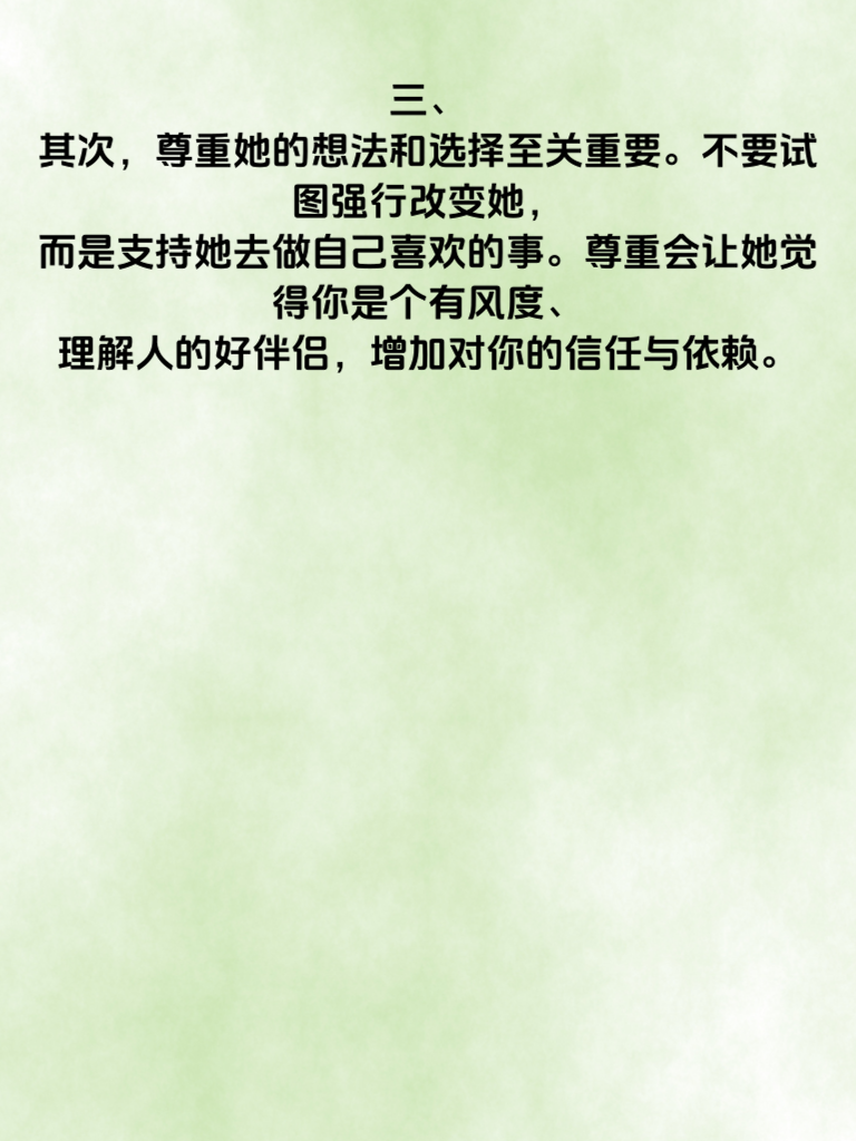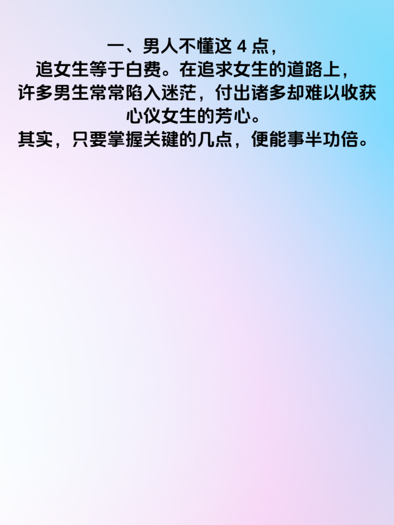 、男人不懂这4点,追女生等于白费。在追求女生的道路上,许多男生常常陷入迷茫,付出诸多却难以收获心仪女生的芳心。其实,只要掌握关键的几点,便能事半功倍。 二、首先,要懂得倾听。女生大多希望能有个耐心倾听自己喜怒哀乐的人。当她倾诉时,认真专注,给予回应,让她感受到被重视。这不仅能拉近你们的距离,还能让她更深入地了解你,从而产生好感。 三、其次,尊重她的想法和选择至关重要。不要试图强行改变她,而是支持她去做自己喜欢的事。尊重会让她觉得你是个有风度、理解人的好伴侣,增加对你的信任与依赖。 四、再者,展现真诚与可靠。用行动证明你的真心,答应她的事一定要做到。真诚是打动人心的基石,可靠则会让她在你身边有安全感,如此,她才更愿意与你携手同行。 五、最后,保持自身魅力。不断提升自己,无论是内在的修养还是外在的形象。有魅力的男人总能吸引女生的目光,让她为你倾心。记住这4点,愿你在追爱的路上顺遂如意。