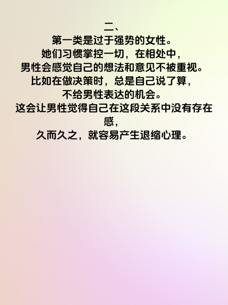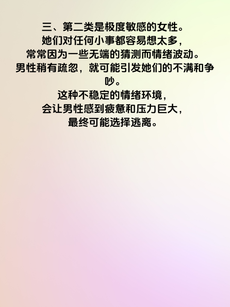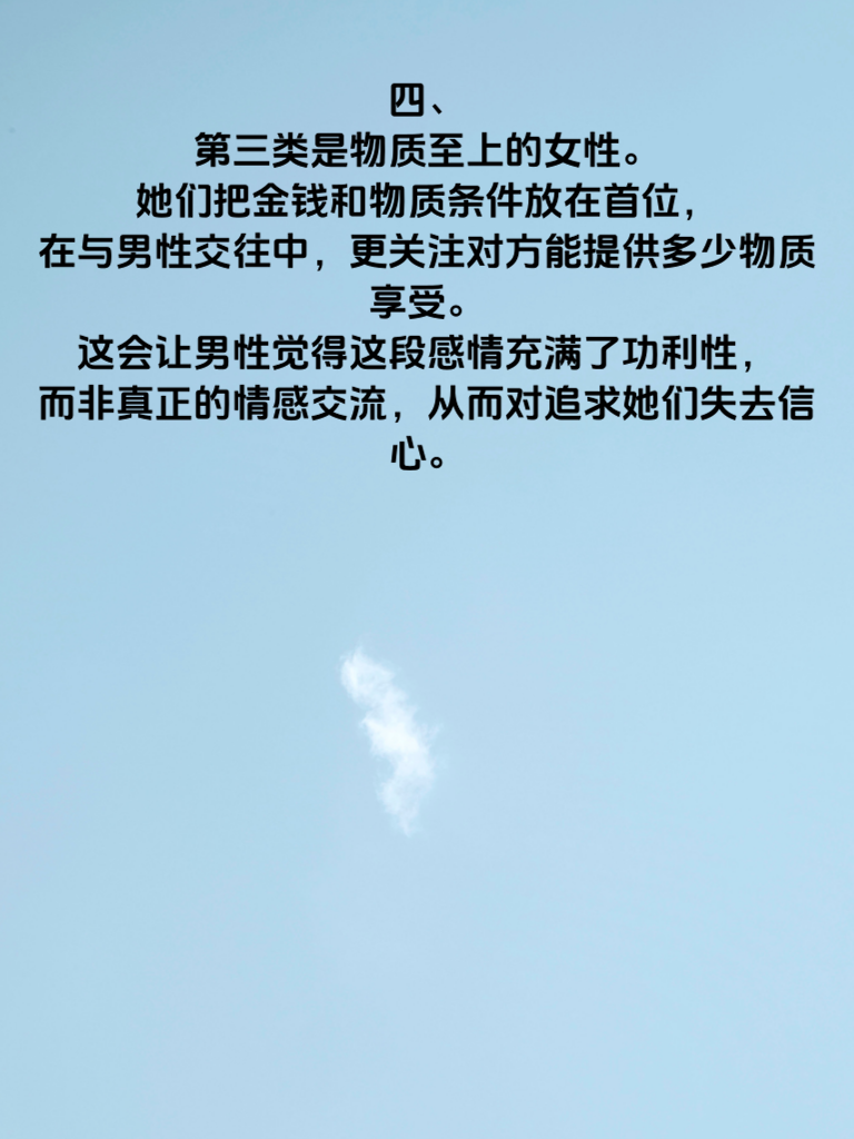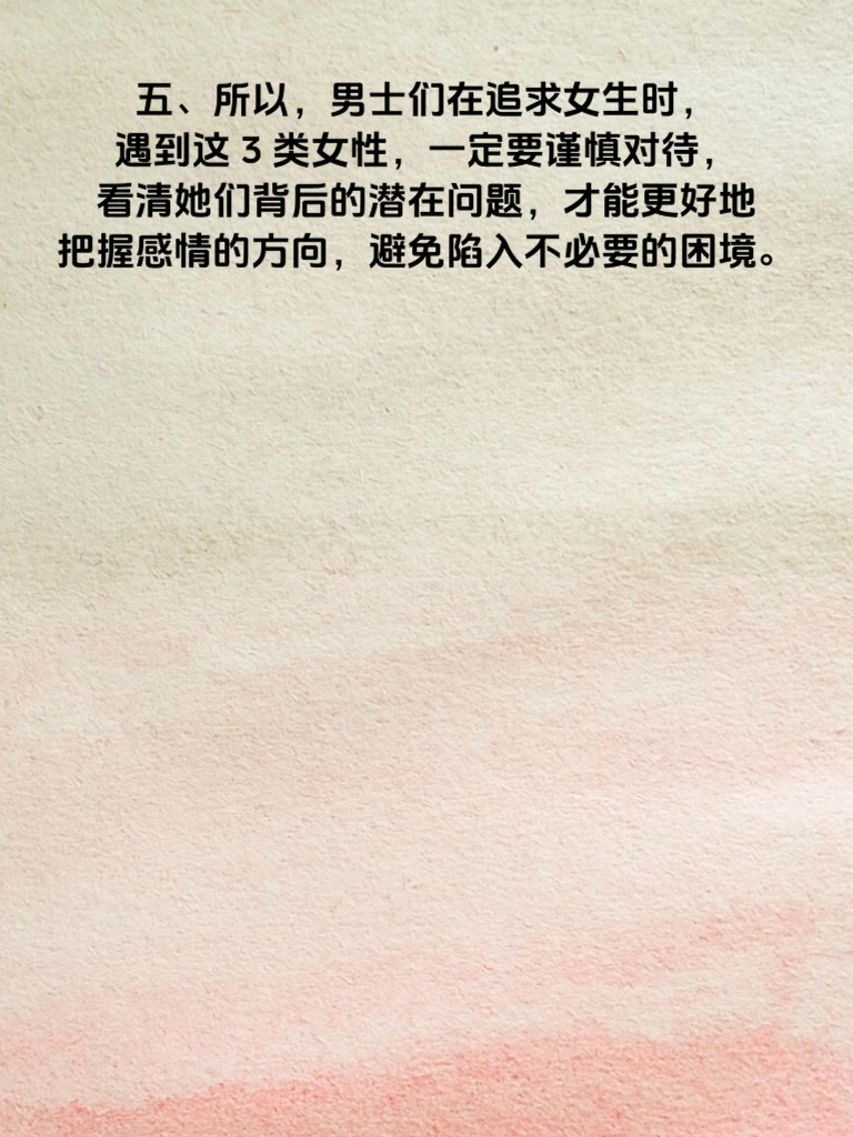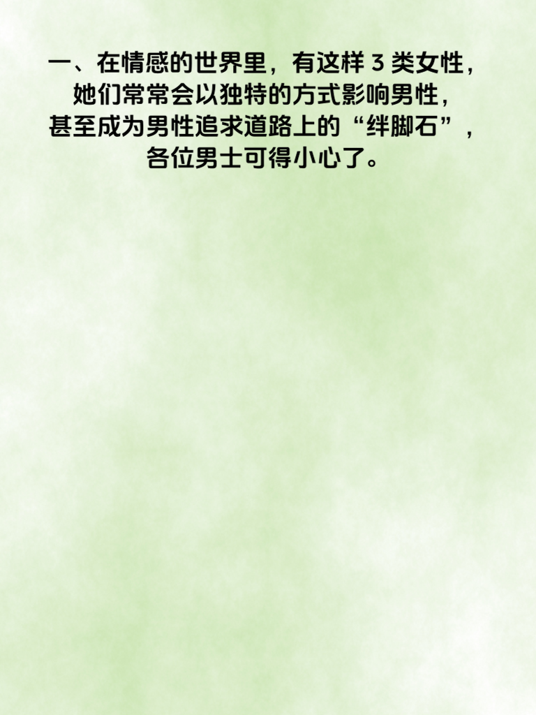 一、在情感的世界里,有这样3类女性,她们常常会以独特的方式影响男性,甚至成为男性追求道路上的“绊脚石”,各位男士可得小心了。 二、第一类是过于强势的女性。她们习惯掌控一切,在相处中,男性会感觉自己的想法和意见不被重视。比如在做决策时,总是自己说了算,不给男性表达的机会。这会让男性觉得自己在这段关系中没有存在感,久而久之,就容易产生退缩心理。 三、第二类是极度敏感的女性。她们对任何小事都容易想太多,常常因为一些无端的猜测而情绪波动。男性稍有疏忽,就可能引发她们的不满和争吵。这种不稳定的情绪环境,会让男性感到疲惫和压力巨大,最终可能选择逃离。 四、第三类是物质至上的女性。她们把金钱和物质条件放在首位,在与男性交往中,更关注对方能提供多少物质享受。这会让男性觉得这段感情充满了功利性,而非真正的情感交流,从而对追求她们失去信心。 五、所以,男士们在追求女生时,遇到这3类女性,一定要谨慎对待,看清她们背后的潜在问题,才能更好地把握感情的方向,避免陷入不必要的困境。