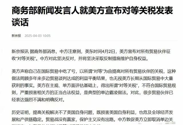 信息源:新京报发布的“商务部新闻发言人就美方宣布对等关税发表谈话”的报道。