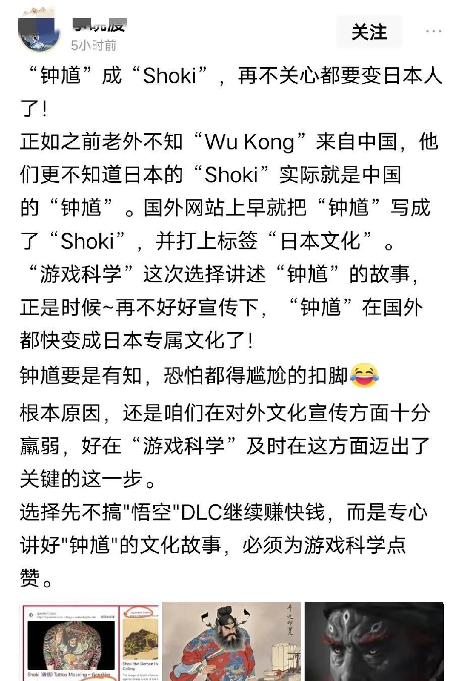 日韩对黑神话钟馗下手真快,黑神话钟馗作为黑神话悟空的系列,昨天刚发布预告,就引起国内外游戏玩家的轰动,万万没想到日本人和韩国人,就开始有人说钟馗是它们的文化了,其实这证明我们的文化优秀,才有人抢,也充分说明日韩的文化的根就在中国,因为它们的大部分文化的原型都在中国,所以重要在于对外宣传,现在游戏就是一个重要的宣传方式,大部分游戏玩家,喜欢这个游戏,就会去研究这个游戏人物背后历史,所以这些游戏是中国人做的,日韩怎么说这是它们的也没用,纯粹自嗨而已,问问那些游戏玩家就知道了!